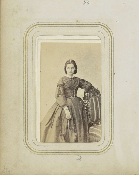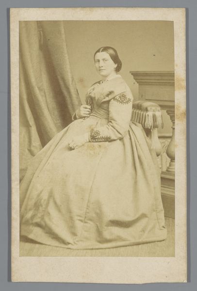 Editor: This is a photograph titled "Portret van mevrouw J.C. Sauveur in een geplooide jurk" by A. Böeseken, around 1863. It’s a fascinating peek into the past, almost like stumbling upon a lost memory. The woman’s gaze is quite intense. What captures your attention in this portrait? Curator: It’s the sheer weight of expectation, isn’t it? Look at the fabric of that dress; it cascades like a waterfall, yet the light barely kisses its surface. The romance isn’t in the frills, but in the unwavering composure of mevrouw Sauveur. I wonder, what stories does she hold behind those eyes? Does the stiffness of the pose reveal something about the culture in that time period? Editor: Absolutely! I’d agree with your sense of unwavering composure. Do you think there's symbolism in her attire? It's striking, and I notice it is echoed around the border too, of this encased object. Curator: Good spotting. In the Romantic period, portraits weren't just about likeness. Her ornate dress, whilst typical of the era, it's perhaps communicating status, aspiration. Maybe even a hint of defiance. Do you see how the light seems to cradle her face, almost isolating it? I think Böeseken’s romantic vision hints at this. It reminds me, actually, of how my great-grandmother, would clutch a faded photograph of her mother… same wistful knowing. Editor: I like that perspective! Thank you, I see so much more of a complete story when thinking about those different levels now. Curator: It’s all about connecting the dots, isn’t it? Seeing the world through another's lens and their perspective can also connect our own!