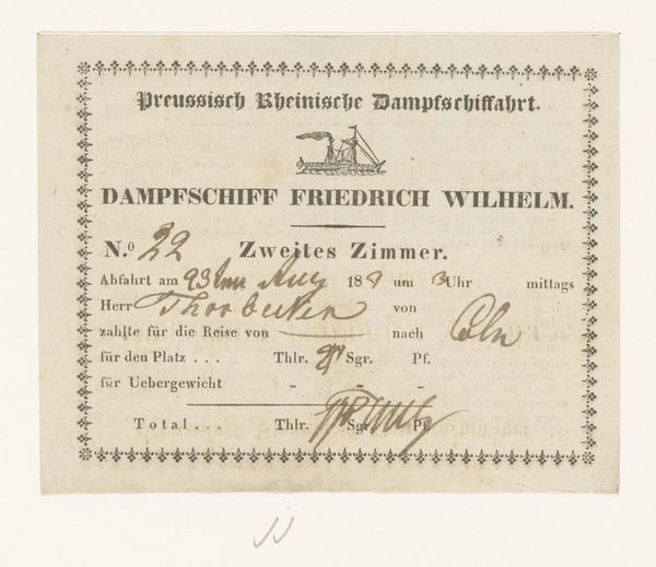 Editor: Here we have "Document," potentially from 1833-1838, crafted by an anonymous artist. It’s a printed ticket, a fragile piece of paper with bold calligraphy. The mood feels bureaucratic, almost detached. What can we discern from this fragment? Curator: This seemingly mundane piece of ephemera speaks volumes when we situate it within its historical context. Consider the rise of steamships in the 19th century. What did that symbolize for society? It’s about progress, trade, movement of people and ideas – but for whom? This ticket grants access to "Zweites Zimmer," second class. Editor: So, class is a consideration? Curator: Precisely. Transportation became stratified. While steamships connected cities and countries, they also reinforced existing social hierarchies. The price listed here tells a story. Two Thaler and twenty…what does that represent in relation to a working person’s wages? Was the dream of progress available to all? Look closer: it says “Dampfschiff Concordia.” Think of "Concordia" – harmony, agreement – but does the reality of second-class travel align with that ideal? What stories of marginalized voices and disparate experiences might this paper omit? Editor: That really shifts my perspective. It's not just a ticket; it's a signifier of social and economic divides within society, revealing the complexities of that era. Curator: Exactly! Objects like these are embedded with social relations, encoded with the biases and power structures of their time. Looking closer helps us challenge the narratives around technological advancement. Editor: Thank you; I’ve gained a fresh understanding today! Curator: My pleasure! Examining such pieces helps us contextualize the past.