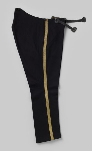Curator: Alright, let's discuss these stocking. We have here, "Kous van bruinzwarte glanskatoen met een smalle verticale streep op de klink eindigend in een eikelvormig motief en twee beigekleurige strepen in de smalle boord" or a stocking in a dark brown, shiny cotton, featuring a thin vertical stripe near the seam, ending in an acorn shaped motif, finished with two beige stripes at the top hem, circa 1800-1820. Editor: Huh, the first thing that comes to mind is…melancholy elegance. They're somber, almost severe, but the material looks deceptively soft. Like holding onto something precious while bracing for bad news. Does that even make sense? Curator: It makes perfect sense. Their very existence is steeped in the realities of the late 18th and early 19th centuries: revolution, industrial growth and colonialism that underpinned textile trade and fashion. Those understated beige stripes at the top hints that it once belonged to someone wealthy enough to afford this kind of adornment. Editor: Shiny cotton! Those two words bring forth strange desires and emotions, a kind of raw hunger. It must’ve been something truly special to have back then. Curator: Precisely. Textiles were hugely significant economically, and socially. Fashion wasn’t just a matter of personal taste. Consumption habits were political statements, linked to global commerce, or the patronage of certain local industries and new ideals. The colour brown itself, particularly in the 18th and 19th century acquired some connotations to rurality, and middle-class sensibility. It's all interwoven. Editor: You’ve unpicked these stockings! What started out like something found in a box now tells so much. Makes you wonder about the lives, hidden feelings of someone who wore these! Curator: Indeed. Everyday garments bear history of material conditions, social codes and our imagination. Thank you for these reflections. Editor: It was a genuine pleasure, thank you!