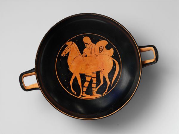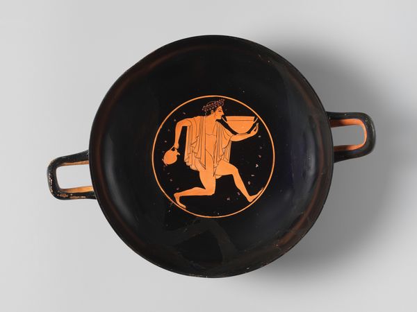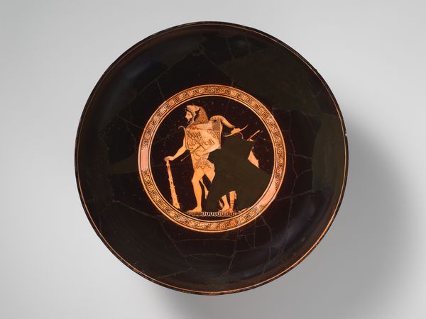 Curator: This drinking cup, a terracotta kylix, dates all the way back to 499 BC. It's currently housed at the Metropolitan Museum of Art, and the artist responsible is believed to be Makron. Editor: Wow, almost two and a half millennia old... It looks surprisingly delicate for something that's been around for so long. The black and red figures pop against that circular backdrop. Very elegant, even in its simplicity. Curator: Simplicity belies sophistication, don’t you think? Imagine the process: forming the clay, applying the slip, then that intricate firing technique to get the black gloss! This wasn't just made to be pretty. Think of the skilled labour involved. This cup likely represents communal activity: perhaps a symposium gathering? Editor: That’s interesting because it gives a peek into everyday life back then – people drinking together, creating shared experience. Do we know what kind of scenes the artist depicted? Curator: Well, Makron favored narratives often lifted straight from daily routines or popular myths of the era. We see two figures engaged in some sort of discussion. The fellow is almost completely nude except for the cloth draped over his shoulders and arms. The second is slightly more covered; she also has an object in her right hand; a papyrus or small blade perhaps. Editor: So, this vessel wasn’t destined to become a static object frozen in time. This terracotta experienced a life that touched many lips, becoming the very center of conversation as it moved between hands— the vessel of memory-making. Does that resonate with you in terms of its creation or purpose? Curator: Absolutely. I see it as more than mere decoration. Its purpose and construction demonstrate that objects contain not just aesthetic beauty but historical information encoded within its materiality and social contexts as well, speaking to community in the ancient world.. It evokes shared moments, echoes of laughter, even whispered secrets under dim light… which makes you consider where its broken and missing parts are? I find I’m inventing their trajectory too. Editor: I'm compelled by the journey of raw materials transformed by human intention, labor, and artistry, eventually into a culturally valued product and an invaluable artifact now housed in a museum. It's about production as much as it's about pure artistic vision, the intersection between daily ritual and craft. Curator: Indeed. A vessel carrying both drink and stories, bridging past and present.