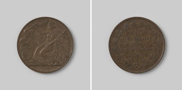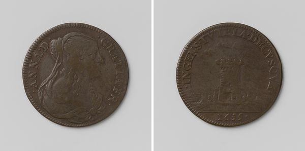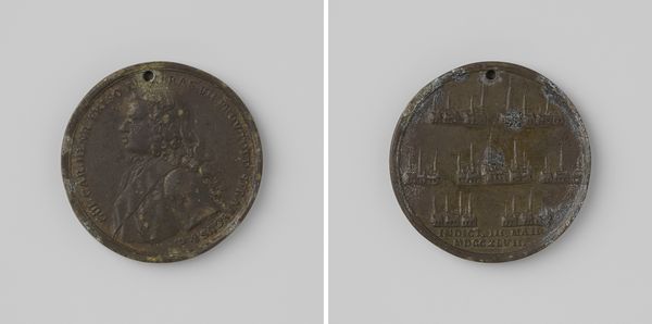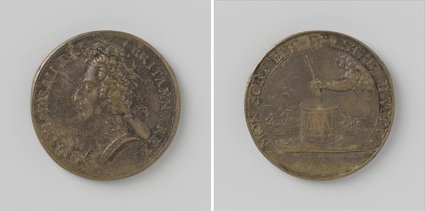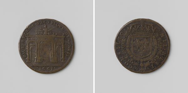 Editor: Here we have "Vrede van Rijswijk," or "Peace of Rijswijk," a metal relief engraving by Philippe Roëttiers from 1697. Its compact scale creates a certain intimacy, and I'm curious about its visual elements, the composition of each side in particular. What do you see in this piece? Curator: I see a skillful orchestration of symbolic forms. Notice how the artist utilizes the circular format to divide the narrative, contrasting war and peace. One side features a classical temple, signifying tranquility. On the other side, a figure with an olive branch triumphing over heraldic crests. Consider the relationship between the depicted figures and the inscriptions. How does that textual frame amplify or redirect your interpretation? Editor: It's like two sides of the same coin, quite literally. The inscriptions encircle each image, acting as a sort of border or limit to what's depicted. I notice how the figure holds an olive branch, a well known symbol of peace, so that could mean the imagery isn't just a random series of images. Curator: Exactly. It functions semiotically, triggering a set of recognized codes. Reflect also on the texture achieved through engraving; its precision delineates forms and articulates minute details. Is there anything specific about Roettiers’ technique that strikes you? Editor: The textures and contrast between the lines and flat planes creates quite the illusion! I learned the texture in engraving are what give the image the "light" in the darkness, in this case! Curator: A fine observation. Through a study of material and technique, we unlock layers of intentionality within this baroque object. Editor: Thanks for the deep dive, this has really broadened my view on this fascinating piece of art! Curator: Likewise, seeing it through your perspective brought the visual texture into clearer view.