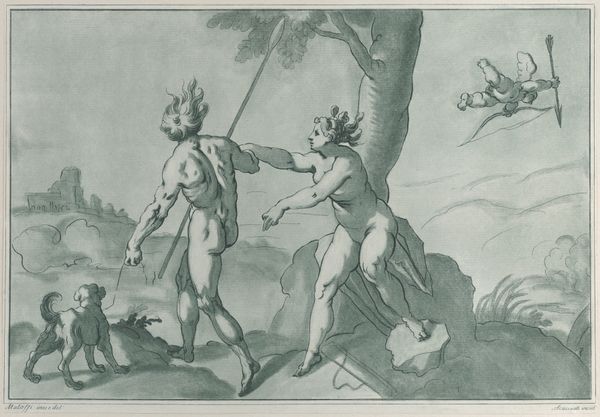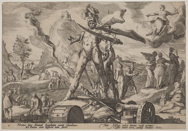 Curator: Hendrick Goltzius, a leading Northern Netherlandish engraver, created this piece in 1589. Titled "Daphne Changed into a Laurel Tree," it's a striking example of late Mannerist printmaking, showcasing his virtuosity with the burin. Editor: My immediate reaction? It’s dynamic but also deeply unsettling. Daphne's transformation looks agonizing, not liberating, and Apollo's pursuit seems aggressive rather than amorous. The detail is incredible, but the mood feels…fraught. Curator: Absolutely. Goltzius’s engravings were renowned for their dramatic flair, heavily influenced by classical sources and mythology, but also marked by an anxiety regarding artistic representation. He operated within a complex network of artists and patrons, responding to shifting cultural demands and theological dictates in the wake of the Reformation. This narrative – of pursuit and desperate escape into another form – can be read on multiple levels. Editor: Exactly. The power dynamics are impossible to ignore. It plays into a dangerous history of representing female agency as monstrous, as something that needs to be contained or literally transformed. It almost suggests Daphne *deserves* to become a tree because she resisted Apollo’s advances. I keep wondering, was Goltzius aware of the inherent patriarchal message in the Ovidian tale, or simply replicating it? Curator: It's likely he saw it primarily through a lens of established iconographic traditions, intended for an elite, educated audience. Consider the market for such prints, the learned circles who’d engage with the mythological references, the artistic competition inherent in representing classical themes... Editor: True, but intention doesn't negate impact. What were the implications of circulating such images? Who consumed them? The female body as the site of violence or metamorphosis becomes normalized, artistic license overshadows ethical concern. This makes it vital to contextualize artwork historically but examine through a contemporary lens. Curator: I agree the work sparks very relevant critical dialogues. The composition showcases an awareness of spatial dynamics with Goltzius utilizing the landscape to amplify tension. Also, the crisp lines and tonal contrasts showcase mastery over engraving. It became, therefore, a visual exercise too. Editor: I am left questioning what we truly celebrate within art and, to that end, it invites discussions that address questions regarding history, power, and transformation. Curator: Indeed. Examining its historical significance is enriched with present-day ethical introspection.