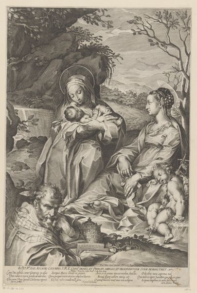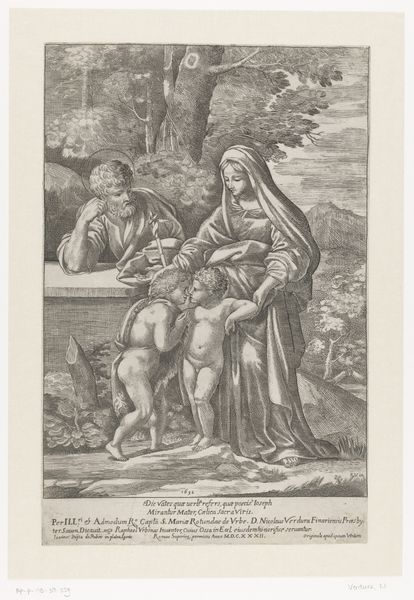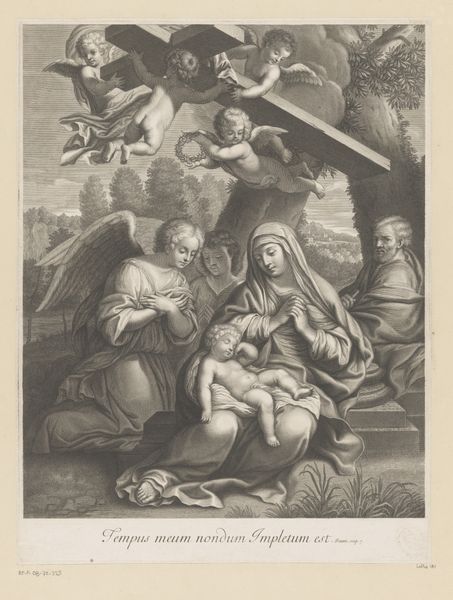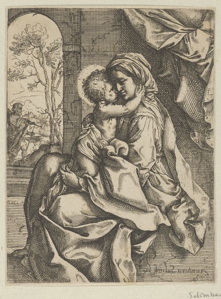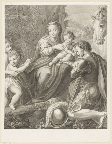 This is Gilles Rousselet’s monochrome print, made some time between 1614 and 1686. We see Mary holding the infant Jesus, while Saint Anthony of Padua kneels in reverence. Notice the formal structure which is built upon a series of interacting lines and tonal contrasts. Mary and Jesus are radiant, positioned in the upper-left quadrant, while Saint Anthony occupies the lower-right. This creates a diagonal tension that divides and animates the composition. The artist employs an interplay of light and shadow to guide the viewer’s eye through the scene; from the divine light emanating from Mary, to the shadows that define Saint Anthony's contemplative posture. The composition invites us to consider how the structural elements evoke a sense of divine encounter. The artist skillfully balances formal elements to construct a semiotic field, encouraging a dynamic interpretation. This piece invites us to appreciate the ongoing dialogue between artistic representation and spiritual contemplation.