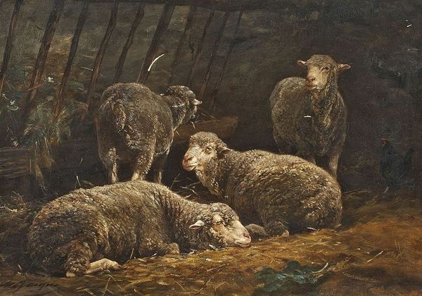 Curator: My first thought is "Oh, these sheep are just so content". Like, deeply at peace. They all look like they're enjoying a warm nap, sunning themselves after a long day of just...being sheep. It’s remarkable! Editor: Yes, I agree. They have a distinct feeling of serenity. The way they're arranged together gives the impression of mutual dependence and communal comfort. These qualities can certainly offer an understanding of social dynamics in rural communities, especially labor distribution. Curator: Exactly! What I especially adore is how Bonheur handles the textures. The wool practically begs to be touched, you know? You just want to dive right into that fleecy embrace. It’s masterfully done with oil paints. She had a deep love for animals; it's evident in how she captured them. Editor: Indeed. It's fascinating to view how Bonheur, who was deeply enmeshed in animal life, depicts them through an elevated lens, especially given the broader economic structures wherein their bodies, their fleeces, have historical and continued use. It makes me think of Donna Haraway’s concept of companion species... Curator: Oh, I love that comparison! They're truly more than just wool producers in her eye. They possess distinct individual qualities, yet Bonheur has united them here so sensitively. It feels almost spiritual! It is important to highlight the ways gender roles shape interactions with agriculture; for Bonheur, painting professionally also brought questions surrounding the types of knowledge or skill expected of female animaliers. Editor: Certainly. In regards to gender, it’s not uncommon that artists like Bonheur navigated social conventions within the art world. I think there is a kind of dialogue created by how she negotiates rural imagery that romanticizes it as pastoral but still speaks to labor and agriculture. What are your overall feelings towards realism or Romanticism as descriptive style tags? Curator: Oh, well for me the debate is unnecessary since the distinction dissolves upon further consideration of feeling versus technique and how entwined the two can become! Regardless of the critical background, "Heads of Ewes and Rams" just warms my heart; it evokes simpler days on the farm! Editor: It leaves me feeling that this pastoral imagery acts as a social mirror. It allows us to ruminate over our ties with animals and ponder their importance, especially within larger dialogues of industrialization.