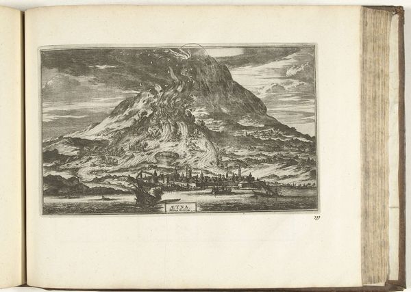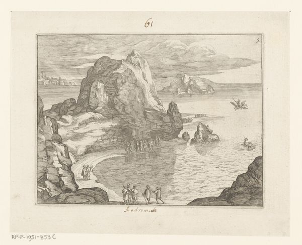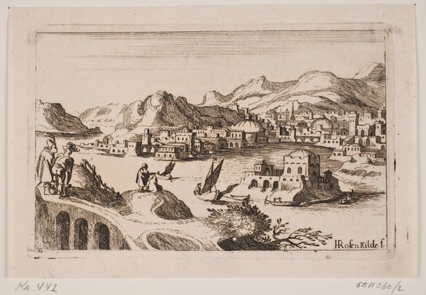 Curator: Hendrick van Cleve III created this engraving of Puteoli. Editor: It has such a stark and dramatic feel! The mountains loom over the bay, and the details are incredible. Curator: Van Cleve, active in the 16th century, likely aimed to represent the city’s strategic coastal importance and classical heritage. The ruins point towards a bygone era. Editor: I see that, but the enduring power of the landscape is what captivates me most. What did the concept of landscape even mean to the people then? Curator: That's precisely the question worth interrogating. Editor: It makes you wonder about our relationship with place and history.
