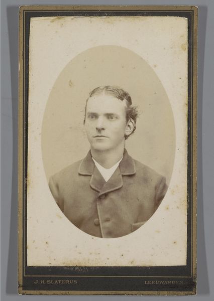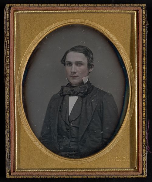 This is an untitled portrait of a man by Edward Anthony, created using photography. The photograph presents a somber tonality, achieved through a narrow spectrum of blacks, whites, and grays. The composition, enclosed within an oval frame, directs our gaze toward the sitter’s face. Notice the balance and symmetry maintained in the arrangement of the subject's features and attire, from the neat parting of his dark hair to the carefully knotted tie, suggesting a structured presentation of self. Consider the historical context in which the daguerreotype emerged, a period marked by the rise of positivism and an emphasis on empirical observation. Photography, with its apparent ability to capture reality objectively, reflects these values. The very act of portraiture during this era becomes a statement about identity and social standing. The photograph's formal qualities—its tonal range, composition, and the subject’s studied pose— invite us to consider the broader cultural and intellectual currents shaping both the creation and reception of photographic images. Each element serves as a sign, contributing to a larger discourse about representation, identity, and the nature of perception.