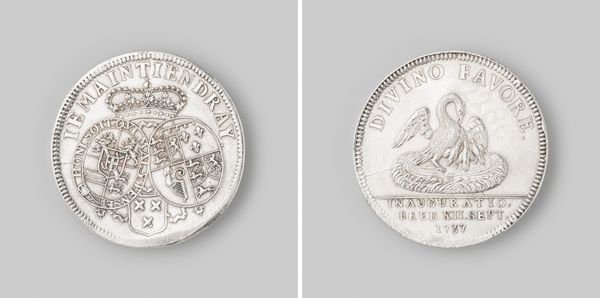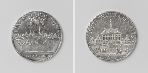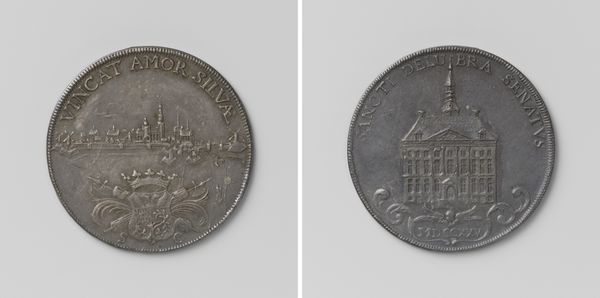 Editor: This is the Vroedschapspenning van de stad 's-Hertogenbosch, or Council Penny of the city of 's-Hertogenbosch, created in 1727. It seems to be made from metal, maybe silver. It is quite detailed. What significance do these images have? Curator: This coin or 'penny' operates on multiple symbolic levels. It's not just currency but a miniature monument encoding the city’s identity and aspirations. Consider the female figure seated amidst the cityscape. Who might she represent and what does her posture convey? Editor: Well, she has a spear and a shield, so maybe a protector? I wonder if the building on the reverse side of the penny is the city hall? Curator: Indeed. And the building itself, rendered with precise architectural detail, functions as a symbol of civic order and authority. The texts encircling the imagery act as verbal anchors, guiding the viewer to interpret the visuals in specific ways. Notice anything about them? Editor: There are classical references in the text and in the design elements; it's reaching back into that historical vocabulary, which projects the city as sophisticated and enduring. What can we learn from this use of Baroque style for civic imagery? Curator: It presents the city as both modern and timeless. By combining classical motifs with contemporary architectural representations, the coin aims to create a sense of historical continuity. Editor: So it’s not just a record of the city but also an active participant in constructing its identity? Curator: Precisely. Each symbol and artistic choice resonates with cultural memory, subtly reinforcing the power and legitimacy of 's-Hertogenbosch. The image weaves history and the present into something the citizens can carry with them. Editor: Fascinating. I’ll never look at a coin the same way again!