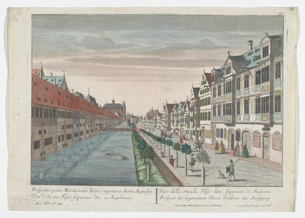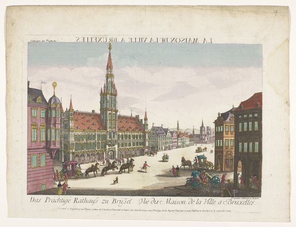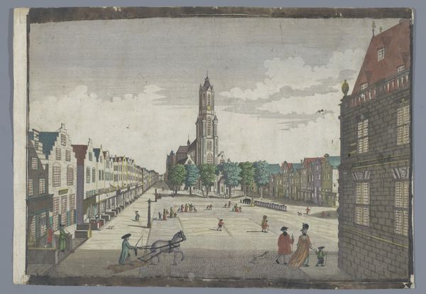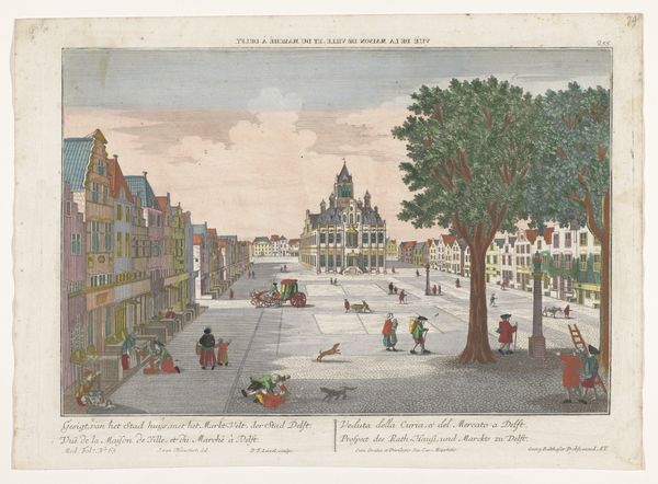 Curator: Oh, I find this piece incredibly charming! The artwork is titled "View of the Town Hall on the Grote Markt in Schiedam" and it was created sometime between 1742 and 1801. Editor: It’s deceptively simple. The subdued palette of watercolor and etching hints at its time, but look closer. It’s an organized view of civic life as observed through printmaking, not pure fine art. The visual order emphasizes material and labor: etching requires particular craftsmanship and training, which lends importance to understanding how art is effectively "made." Curator: Yes! The piece seems to breathe with the very pace of life, the quiet hum of the Dutch Golden Age filtered through a Baroque sensibility. I adore the way the buildings sort of melt into the sky, giving a soft focus that highlights daily rhythms. The figures, small and full of purpose, speak to a busy yet contained existence. Doesn’t the market square call to mind whispered secrets and lively deals? Editor: Precisely. See how the market isn't just presented as backdrop, but a physical manifestation of economic relations. Every detail represents the cost of goods, the work done, the material choices within structures: bricks laid, clothing manufactured. Printmaking ensured accessibility beyond the elite: a democratization of information and image. So its success lies not in some creative gesture by a “lonely” genius, but collaboration across numerous fields from papermaking to distribution. Curator: Perhaps… or maybe there’s something to be said about that Baroque structure of the Town Hall. That striking presence of power contrasts with these soft washes! And that contrast allows us to dream… isn’t that what we look for? An awakening of imagination where power and humanity meet? Editor: But this imagined past reflects present-day economies that define our experience, our use and access to art through institutions and consumption, don't you think? So we cannot deny the artwork's production is part of its charm... to examine the materials tells you more about societal desires than just visual charm, itself influenced by materials at the moment! Curator: Perhaps. The "View" offers a way of seeing as a complex weave. Editor: Precisely. By grasping how its very "fabric" came into being we see societal trends within artistry.