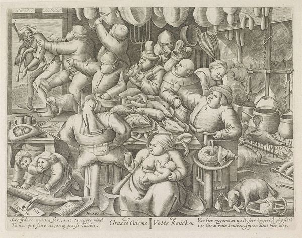 This print, "Rich Kitchen," of unknown date and authorship, presents a scene of unrestrained feasting. Works like this, during the 16th and 17th centuries, offered a window into social customs, and often served to reinforce or critique societal norms. Here, we see a room full of people, and animals, indulging in an abundance of food and drink. The bodies are rendered with a certain heaviness, emphasizing their physical indulgence. Through an intersectional lens, we might consider how the representation of the body here intersects with class and moral judgements. Are these figures being celebrated for their success, or are they being critiqued for their excess? The print invites us to reflect on our own relationship with excess, and the ways in which societies have historically judged different forms of consumption. "Rich Kitchen" serves as a reminder of how art can reflect, and shape societal attitudes towards abundance, and moderation.