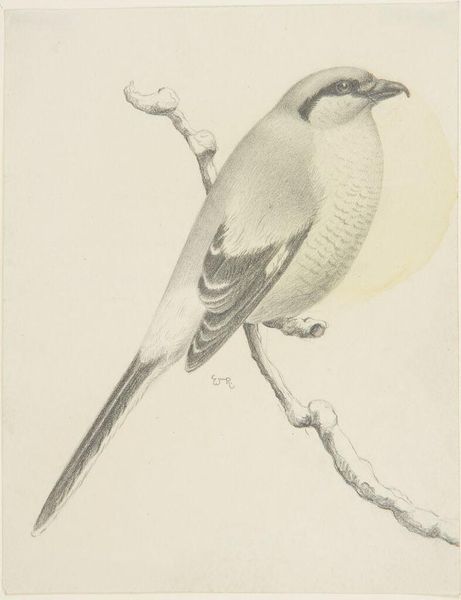 Curator: I'm immediately drawn to the bird's expression – a kind of quizzical alertness. Editor: Indeed. We’re looking at William Rowan’s pencil drawing, aptly titled "Kingfisher," which lives here at the Harvard Art Museums. Its modest size, about 8 by 6 inches, invites close inspection. Curator: Absolutely. Kingfishers often symbolize good luck and abundance, across cultures. The fish he's caught reinforces that prosperity theme. Editor: You're right, there's a sense of capturing potential – the sharp beak and forward gaze suggest focused energy. What do you make of its simple composition? Curator: It feels intentionally spare. The artist seems to highlight the bird's inherent regality, without needing much else. He's saying, "Look at this creature, isn’t it magnificent as it is?" Editor: So true. Well, I feel I can certainly appreciate this delicate artwork more now. Curator: Me too, I think its very simplicity speaks volumes.