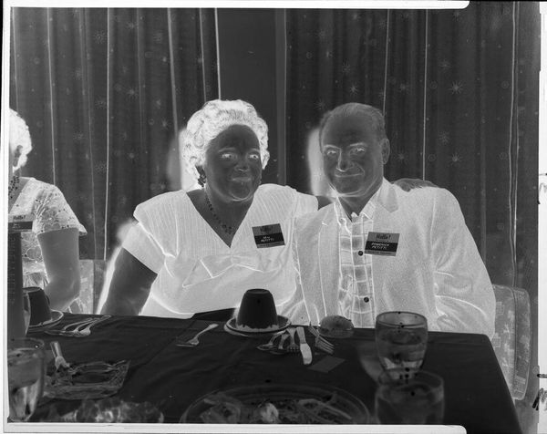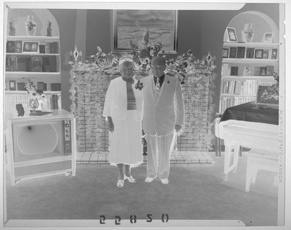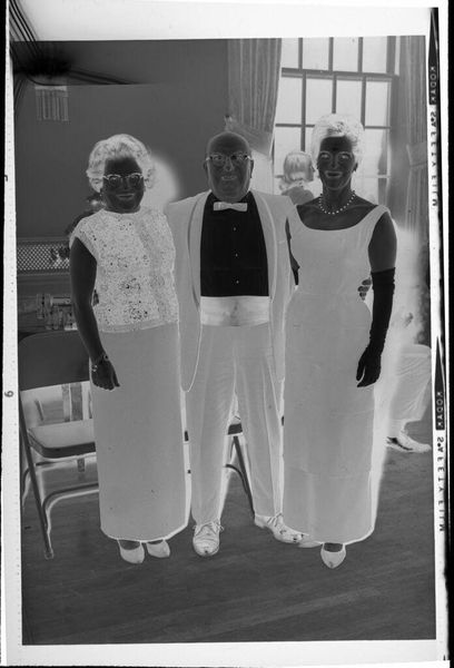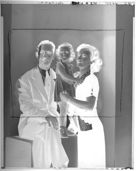 Curator: This photograph by Martin Schweig depicts a middle-aged couple with two younger women, posed in a living room at Christmas time. Editor: It feels almost unsettling, doesn't it? The stark reversal of tones gives it a ghostly, dreamlike quality. Curator: The composition is quite formal, mirroring the societal conventions of the time. Note how the subjects are arranged in a structured manner before the backdrop of their holiday decorations, hinting at the curated performance of family unity. Editor: And the setting itself—the living room as a stage. It's a fascinating look into the construction of social identity and the rituals surrounding family gatherings. Curator: Indeed. The photograph highlights the complex interplay between individual expression and the prevailing cultural norms that shape our understanding of family and belonging. Editor: It leaves me wondering about the unseen stories, the tensions perhaps hidden beneath the posed smiles. Curator: Absolutely. Schweig's image, in its stark contrasts, invites us to question the narratives we construct around family and tradition.