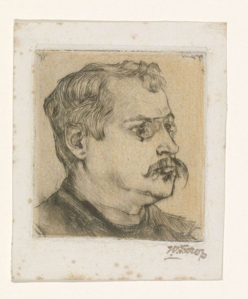 Editor: This etching, "Lovis Corinth," created by Hermann Struck in 1920, is incredibly striking. The rough lines give Corinth a very intense gaze. What do you see in this piece? Curator: I see a powerful engagement with identity and artistic legacy. Struck, a Jewish artist, created this portrait of Corinth during a period of intense social and political upheaval in Germany. Given the rise of antisemitism and the complex relationship between Jewish and non-Jewish artists in the Expressionist movement, it begs the question: What does it mean for Struck to portray Corinth, a leading figure in German art? How does power operate in the relationship between the two artists? Editor: That’s fascinating. I hadn’t considered the power dynamics at play. Curator: Think about the very act of representation. Who has the authority to depict whom? Struck’s mark-making seems to capture something essential about Corinth’s character, but whose gaze are we really seeing reflected here? Editor: So, you're suggesting the portrait is not just about Corinth but also a reflection of Struck's own identity and position within the art world? Curator: Precisely. The act of creating this portrait can be seen as Struck staking his own claim within a complex, often exclusionary, artistic landscape. And how might Corinth himself have viewed being rendered by Struck? This artwork is a layered conversation on artistic identity, cultural belonging, and the complicated nature of portraiture. Editor: This has really opened my eyes to seeing portraits as more than just likenesses. Curator: Exactly! Art provides a lens through which we can better understand not just individual artistic achievements but the broader social and historical narratives that shape them.