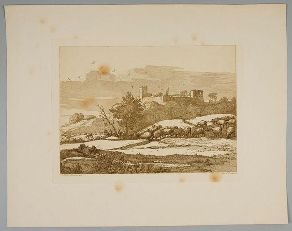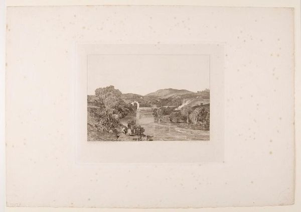 Curator: Let’s consider "A Rock of the commune of Rix" by Adolphe Appian. Editor: I am immediately struck by the stillness. The composition is serene, almost melancholic. Curator: It certainly evokes a mood. Appian, active in the 19th century, often depicted rural France, capturing the lives of the working class. Editor: The etching technique contributes to the sense of quietude. See how the delicate lines define the landscape and reflect light. Curator: Absolutely, and it's essential to remember the social context. These rural communities were undergoing significant change during Appian's time. His work offers a glimpse into their struggles and resilience. Editor: But look at the careful arrangement of forms, the balance between light and shadow. There's a clear formal intention at play, creating harmony. Curator: It's in that harmony, perhaps, we find a reflection of the enduring spirit of these communities amid hardship. Editor: Yes, Appian's skill allows us to consider the historical weight while appreciating the image's aesthetic resolution.