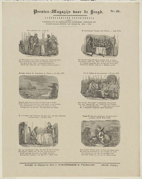 Editor: This is "Vroegere godsdienst der bewoners dezer landen," or "Early Religion of the Inhabitants of these Lands," an 1842 print by Jan Schuitemaker. It looks like a collection of vignettes depicting historical religious events. What strikes me is the almost comic book-like arrangement of scenes. How do you interpret this work? Curator: It's crucial to view this print as more than just a quaint historical depiction. It was created during a period of nation-building and rising Dutch nationalism. Notice how it selectively presents moments of religious conversion. It seems to glorify figures like Boniface while depicting older pagan practices as primitive, therefore asking us to interpret the shift to Christianity as advancement. But what narrative gets erased in that depiction, and whose voices are not heard? Editor: So it's not just a history lesson; it's also making an argument? Highlighting a specific narrative. Curator: Exactly. Think about the act of "civilizing" a population by imposing religious values. Consider the violence often inherent in conversion, not just physical but cultural, erasing pre-existing belief systems and traditions. The print frames this violence as necessary, obscuring the experiences of those who resisted or were displaced. How might we, as contemporary viewers, challenge that narrative and reclaim those perspectives? Editor: It is fascinating how something that appears straightforward actually contains a really biased perspective that tells more than what it seems at first. It reminds me to really look behind the artwork, not only at the image but to see what really happened. Curator: Indeed, it forces us to confront how history is constructed, and the narratives that continue to shape our understanding of identity and belonging. Now, with a wider understanding, perhaps, in time, you’ll adopt that method and further our understanding of the artwork and its true motives.