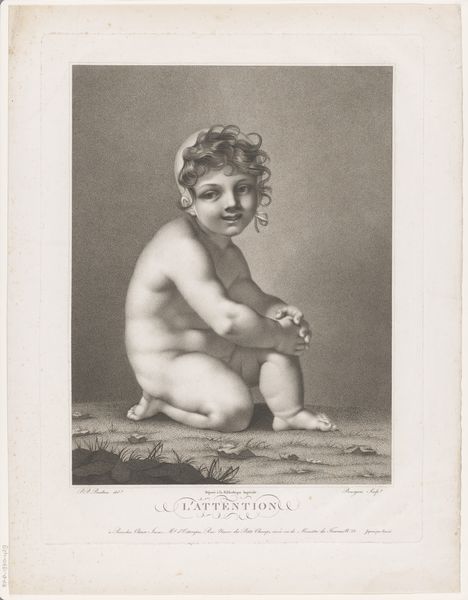 Curator: Isn't this engraving sweet? It's called "Lezend kind" which translates to "Reading Child", created sometime between 1770 and 1825 by Jean Baptiste Bourgeois. Editor: It's a bit saccharine, isn't it? That rosy, idealized baby form so engrossed. Almost cherubic. Curator: Bourgeois certainly had a knack for imbuing innocence and concentration in that tiny, determined face. Notice the subtle cross-hatching technique? It gives real volume to the figure, doesn't it? The textures... that delicate baby skin! Editor: Yes, the cross-hatching adds dimension, but what interests me is how it situates childhood as a moment of intense formation. The child isn't just reading, he’s being inscribed, marked, and molded into a specific type of citizen. Curator: Oh, I love that reading. Are you suggesting a sort of visual... conditioning? Perhaps through allegories popular during that neoclassical era? Editor: Precisely! Consider the history-painting undertones coupled with Neoclassical precision. The nakedness invokes a kind of Rousseauian return to nature, but also emphasizes vulnerability. This image could subtly promote civic duty, discipline... Curator: Discipline—in adorable, chubby package! I like that tension you point out. It speaks to something… bittersweet about expectations versus reality, perhaps? This little kid is already getting pressure! Editor: Well, art often operates that way, no? It makes claims even when it appears to simply represent. But speaking of seeing—can we see beyond this potentially restrictive symbolism? Curator: That is always the big question. I guess it is why art moves me. It reminds me both of our collective baggage, and all the dreams that humanity aspires to… and paints in soft cross-hatching. Editor: I concur. A lovely piece that evokes complicated, enduring contradictions!