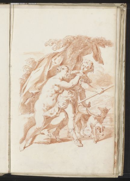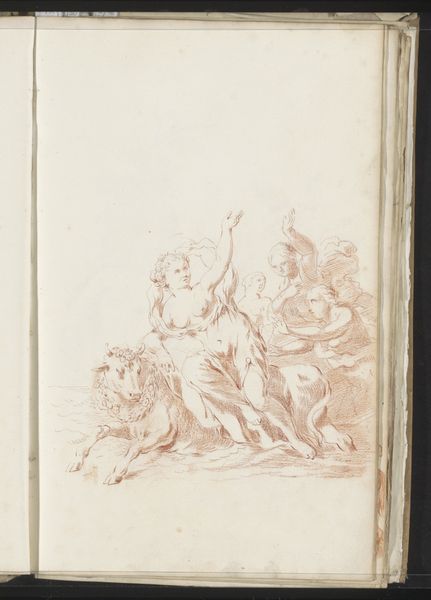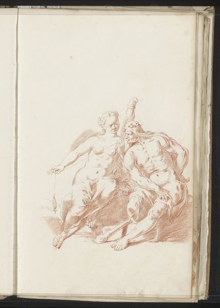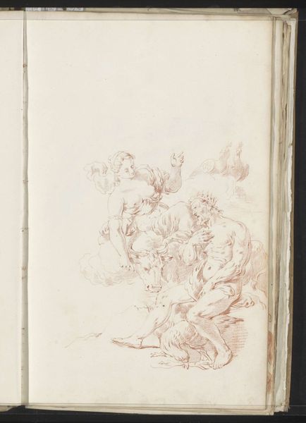 Editor: So, we're looking at "Jupiter and Juno in a Landscape," a drawing in ink from around 1701 by Jacob Toorenvliet. There’s a lightness to the line work that makes it feel almost like a fleeting observation. How would you interpret this piece in its historical context? Curator: I see this as a product of its time. Toorenvliet, working in the early 18th century, clearly understands the market. The Baroque style was waning, but the taste for allegorical scenes and classical mythology remained strong, especially within aristocratic circles who consumed imagery reinforcing their status. This depiction of Jupiter and Juno is not just an illustration of a myth; it's a statement of power and order, reflected back to the elite. Notice how idealized they are – it's designed to appeal to a certain patronage, projecting an image of timeless beauty and authority. Do you see any visual elements that might support that idea? Editor: Yes, the controlled landscape in the background feels deliberately posed rather than natural, further suggesting a staging of power. So, the artistic choices serve a purpose beyond mere aesthetic appeal. Curator: Exactly. Think about the function of art academies at this time, enforcing classical ideals. The style becomes a signifier of class and erudition. The image, therefore, serves as social currency. The mythology lends itself to the demonstration of virtue. This wasn't simply art for art’s sake; it was art as a social and political tool. Editor: I never thought about it like that, as such a direct reflection of the socio-political dynamics. It's changed the way I see Baroque art now. Curator: Precisely! Seeing art through that lens illuminates so much about the priorities and power structures of the era.