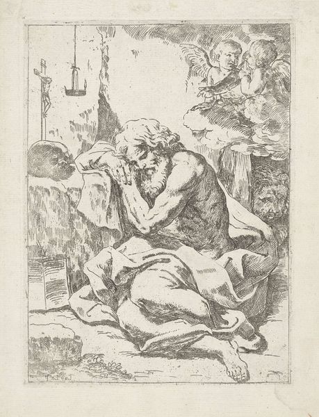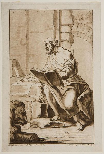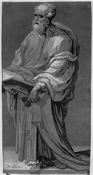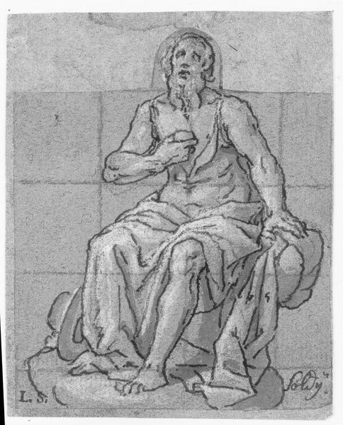Lazzaro Tavarone created this drawing of a turbaned man with grey and brown wash on paper. The turban immediately positions the subject as a figure of wisdom and contemplation, a motif stretching back to ancient Near Eastern cultures. The man's pose, hand to his face while holding a tablet, evokes the classical image of a philosopher or scholar deep in thought. We can see a similar position in depictions of Heraclitus, the 'weeping philosopher,' and even in later representations of melancholic figures in Renaissance art. This gesture, laden with introspection, connects our turbaned man to a lineage of thinkers grappling with profound questions. The image's power lies in its ability to tap into our collective memory of the contemplative intellectual, a figure whose quest for knowledge is eternally relevant. Though the attire and setting may shift across centuries, the essence of human inquiry remains a constant. Thus, Tavarone's drawing is not merely a portrait, but a timeless symbol of humanity's ongoing dialogue with itself.