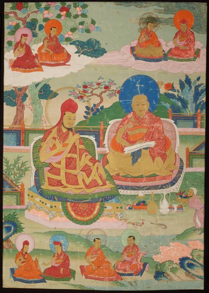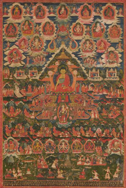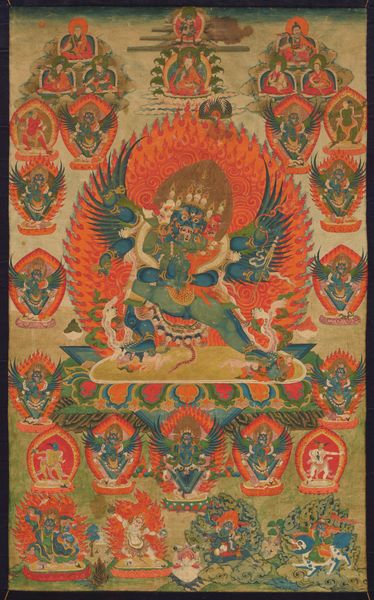 Editor: This is quite a sight! An anonymous Thangka, painted with tempera and ink in the late 18th century, called "Thangka of an eleven-headed Avalokiteshvara." The sheer number of figures is astonishing. I'm curious, what narrative or ideas do you think the artist wanted to convey? Curator: Well, darling, imagine stepping into the mind of a Tibetan monk nearly three centuries ago. It's a wild garden of devotion, isn't it? This isn’t just paint and ink, it's a visual poem, a cosmic blueprint. Avalokiteshvara, with those eleven heads, is compassion in overdrive, each face gazing in a different direction, seeing every plea in the universe. The multiple arms—can you count them all?—aren’t just for show. They're reaching out to help, to heal, to offer solace. Each gesture, each color, each tiny detail sings of the interconnectedness of everything. Notice the gentle way they're seated. Editor: It's…a bit overwhelming! But now that you mention it, I see the individual deities or figures sitting in the geometric formations. Is it like a family portrait almost? Curator: More like a divine ecosystem, love! Think of it as the spiritual internet of its day, connecting earthly realms to celestial planes. Each figure isn't just someone to worship, but an aspect of our own potential. Can you feel how the energy flows? It is an act of contemplation rather than something to simply observe. Editor: I guess I hadn’t thought about it as being about our own potential! That shifts things entirely. Curator: Art, like life, has its funny way of surprising us, doesn’t it? Every look at the Thangka reveals another world of ideas. It makes me smile!