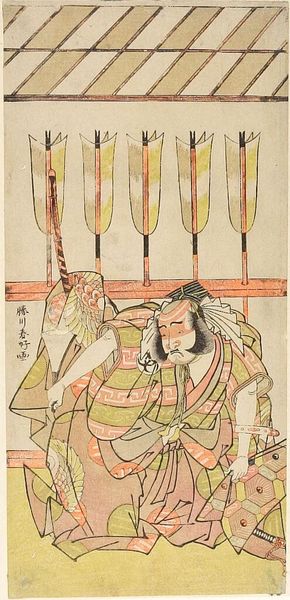 Editor: This woodblock print by Katsukawa Shunshō depicts the actor Matsumoto Kōshirō II. The diagonal lines in the background create an interesting sense of depth. What do you see in this piece? Curator: Structurally, note how the diagonal lines converge with the actor's pose, creating a dynamic tension. The composition balances the static text pillar with the actor's active stance. The artist uses line and form to express movement. Editor: So, the emphasis is on the interplay of lines and forms rather than narrative content? Curator: Precisely. The actor becomes a set of forms arranged to create a visually compelling composition. Did you notice how the artist uses colors in a way that reinforces the dynamic? Editor: I hadn’t thought of it that way, but now I see how the colour helps to establish dynamism. Thank you. Curator: Yes, I hope you come to see the beauty of formalism.