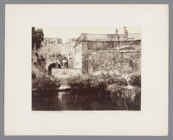 Curator: This gelatin-silver print, taken by Fréderic Boissonnas sometime before 1896, is titled "Balcony of a House and Meadow with Cattle". It offers a serene rural scene. Editor: The mood is pastoral and idyllic, almost staged. The high contrast lends it a dramatic yet dreamlike quality, wouldn't you say? The tonal range pulls you in. Curator: I would concur. The sharp contrast does provide clarity. We see that Boissonnas often focused on landscapes that celebrated the rural life. The turn of the century experienced urbanization and industrialization, so works such as these evoke the simplicity and tranquility of country existence. Editor: Right. Observe how Boissonnas masterfully divides the composition. The left side is anchored by the detailed balcony structure, offering complexity, in contrast to the openness and softness on the right dominated by the animals. There's almost a textural dialogue between architecture and nature. Curator: Yes, the inclusion of the architectural structure is in dialog with nature but also a lens for it. You can feel an intersection of private versus communal as well, as the figures sit secluded, elevated, watching those laboring outside in view. How might this composition reflect social dynamics or perspectives of the era? Editor: Hmm, fascinating. Considering Boissonnas positioned the balcony to face the landscape, it becomes an observation deck. Were those people, or others like them, perhaps removed from working to instead passively own the land's output? It begs one to think about leisure and land use. Curator: Indeed. "Balcony of a House and Meadow with Cattle" is both aesthetically pleasing and thought-provoking. Editor: Exactly. The contrast between the detailed architecture and expansive landscape invites viewers to think about labor, society, and environment back then and the effect of our choices today.