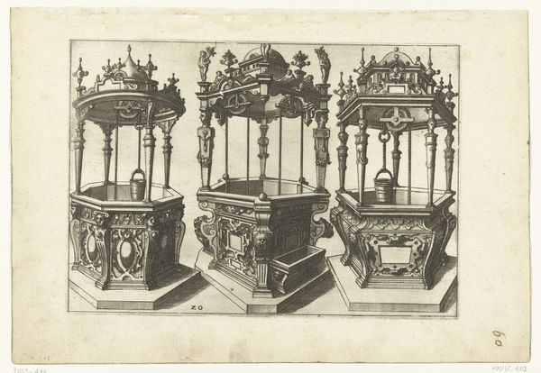 This engraving of three rectangular wells was made by Johannes or Lucas van Doetechum, though the exact date is unknown. At first glance, we might simply see a technical drawing. But what if these wells are more than just practical structures? Made in the Netherlands, a region known for its sophisticated water management systems, this image invites us to consider water as a vital public resource, particularly as the Dutch Republic grew into a mercantile power. The wells are adorned with classical motifs and statuary. This artistic choice elevates these utilitarian objects to symbols of civic pride. The emphasis on public utility is itself a statement of social values. To fully understand this engraving, one might delve into archives of urban planning and engineering from the period, tracing the evolution of water infrastructure and its impact on Dutch society. These historical resources help us to reveal the subtle ways in which art reflects and shapes our understanding of the world around us.