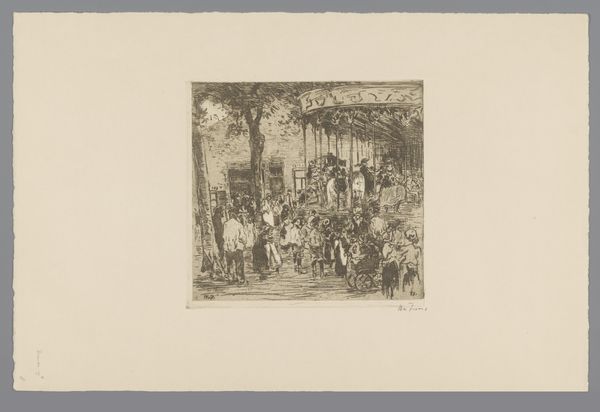 This etching, "Untitled (In the Backyard)," was made by George Hand Wright, and it's a real masterclass in mark-making. Look at how Wright uses these tiny little lines to create a whole world. It feels almost like he’s feeling his way through the scene. The beauty of an etching like this lies in its texture, you know? It’s all about the surface, the way the ink sits on the paper. I love the way he renders the trees, almost scribbling them in. And then, these dark, dense areas that feel heavy and full of shadow. There is a figure in the foreground, a man wearing a hat, look at the fine lines used to depict the brim of his hat, but then the broad, dark strokes of his jacket. Wright's got this beautiful push-pull, a constant negotiation between what’s revealed and what’s hidden. It reminds me a little of James Ensor's etchings, with their similar embrace of light and shadow. It’s like he’s saying, ‘Hey, seeing is never just about looking. It’s about feeling, too.’