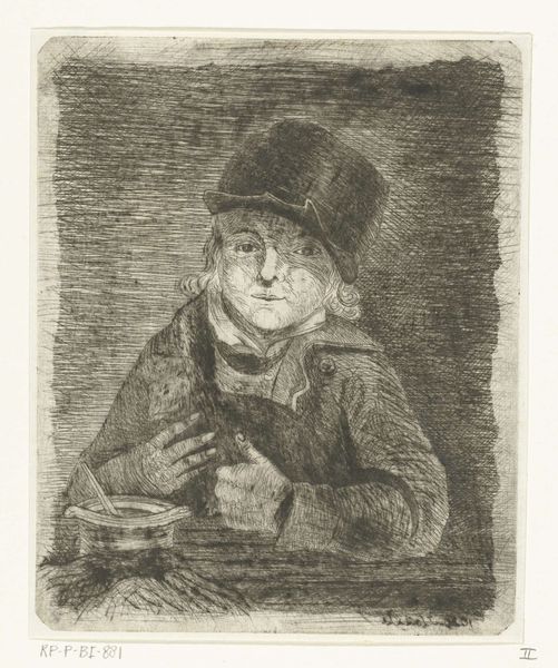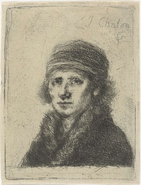 Curator: Let’s take a closer look at "Man met hoge hoed" – or, "Man with a Top Hat" – by Jan Chalon, created sometime between 1748 and 1795. Editor: Immediately, I’m drawn to the immediacy of the work. It’s a simple pencil sketch, quite intimate in scale and mood. The subject's gaze is really striking. Curator: Absolutely. You get a real sense of the artist at work. Given the clear details captured in pencil, this portrait hints at the increasing accessibility and consumption of art materials at the time. What once was reserved for only the wealthy to commission is slowly becoming accessible through material culture to others in society. Editor: Yes, the very fact that it’s a quick sketch is telling. Top hats themselves, even then, were loaded signifiers. The subject here doesn't project status; there's something almost introspective. His eyes, though lightly sketched, hold a certain weight. He doesn’t seem overtly concerned with appearances. Curator: True, but let's consider the hat. Despite its simplicity, the very act of portraying someone with this kind of hat suggests something. The mass production of certain styles like hats indicates a shift toward visual representations of societal roles and norms, as ready-made items define personal image in society. Editor: Good point. And perhaps that very tension - the attempt to embody an ideal through a manufactured object versus the inner, perhaps melancholic reality of the man - is what makes this sketch so captivating. It becomes a broader comment on societal expectation versus inner identity. The visual tension suggests a moment of personal reflection. Curator: Interesting how you tie those meanings together. I am caught by how this drawing gives insight into artisanal making and production outside the scope of painting, underscoring labor that goes beyond traditional “art.” The pencil lines themselves were the work and tool, while still suggesting skill in craft itself. Editor: And perhaps, on a symbolic level, that’s the beauty of the piece—how a seemingly straightforward sketch can speak volumes about cultural aspirations and the human condition, a conversation etched in pencil. Curator: Agreed, it’s thought-provoking to examine how these materials contribute to visual narratives about personhood in Jan Chalon's piece. Editor: Absolutely. "Man with a Top Hat" offers a nuanced and thought-provoking experience, where image and meaning playfully coexist and give access to our ideas.