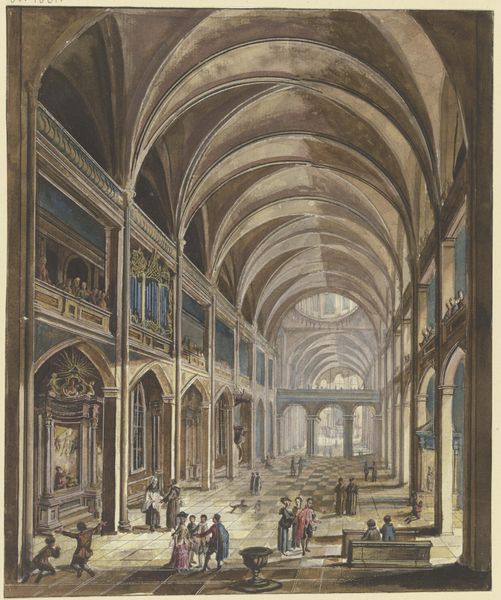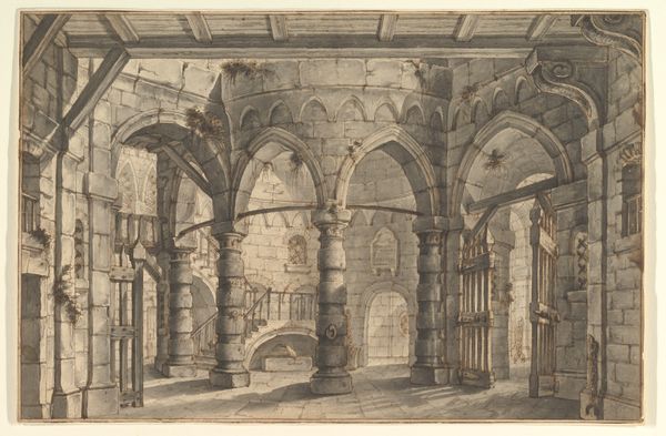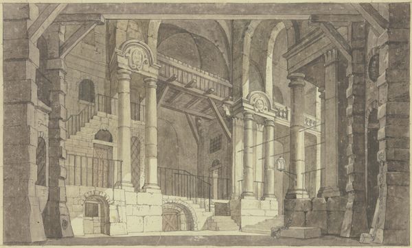 Curator: What an interesting atmosphere! Before us is "Fængselsdekoration med fanger og fangevogtere," which translates to "Prison Decoration with Prisoners and Jailers," attributed to Jacob Fabris and believed to have been created sometime between 1720 and 1761. Editor: It’s so oppressive. The artist's use of brown tempera and oil paint creates a feeling of gloom, a somber world. It also calls to mind Piranesi's architectural fantasies but more controlled. All of the barred windows and dangling hooks overhead amplify the psychological tension and feeling of confinement. Curator: Yes, it presents a unique visual narrative that blends architectural study with social commentary. What I find fascinating is how it presents a somewhat detached view of incarceration, devoid of explicit suffering, suggesting the institutional aspect of the jail, how they wanted to showcase it to the public, and its existence within society. Editor: True, yet it also echoes traditional imagery related to damnation or purgatory. Those arches and columns bear more than a passing resemblance to visual representations of infernal realms, don't you think? And note how even the jailers are partially obscured, adding a layer of moral ambiguity and implying complicity. They could symbolize some gatekeepers of a lower circle in Dante’s inferno. Curator: That's insightful! It moves past a straightforward illustration of daily life in a prison to a powerful statement about power, punishment, and societal control. Considering the Baroque artistic elements on display, it fits into a long history of how architectural spaces are conceived. There's something chilling about this artistic rendering of such themes in that time period. Editor: Definitely. The symbolism here lingers and is truly multi-layered, connecting this single scene with broader understandings about guilt, punishment, and even spiritual torment through recurring tropes. It definitely goes beyond the visual impression of just an interior with jailers and prisoners! Curator: Yes, precisely. Fabris gave us, from a distance, a stark reminder of what justice means to one another and the individual experience versus its implications on the greater system. Editor: I'll certainly not look at keys the same way again. Thanks to that stark atmosphere, these recurring representations are a sober memento!