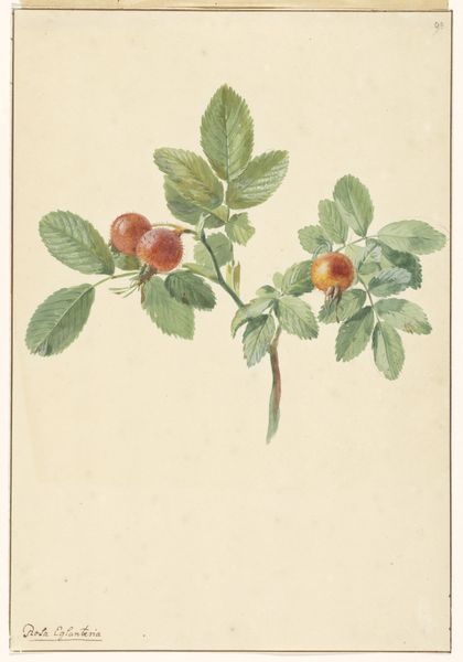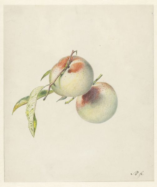 Herman Henstenburgh created this watercolor "Festoen van vruchten" sometime between the late 17th and early 18th centuries. The still life presents a carefully arranged assortment of fruits and foliage, all anchored by a nail at the composition's apex. Note how Henstenburgh organizes the fruits in a triangular fashion. The grapes cascade down the left, balanced by leaves on the opposite side, directing our gaze. Look at the snail on the grapes; what does its inclusion tell us about the piece's themes of temporality and decay? The fruits exhibit a remarkable realism, which invites viewers to consider deeper philosophical implications around the consumption and transformation of natural elements. Consider the artwork's capacity to evoke ongoing contemplation regarding the transient nature of life and beauty.