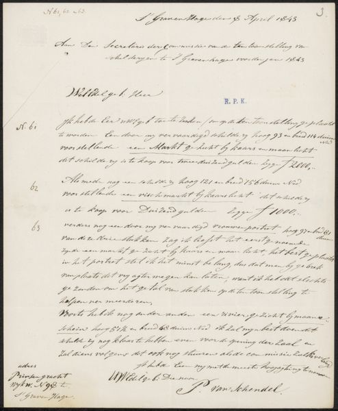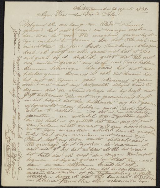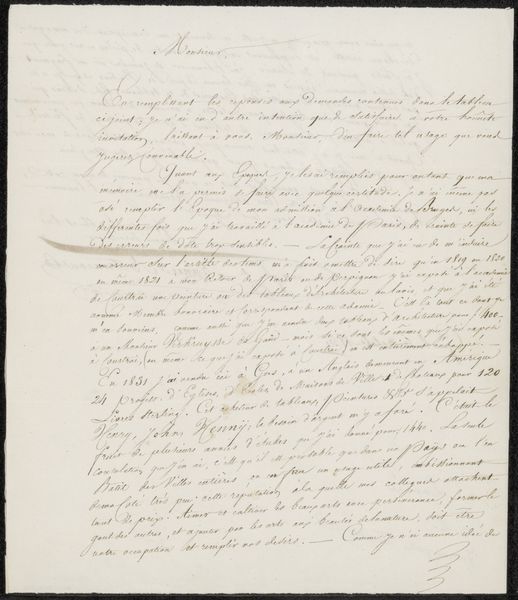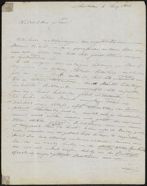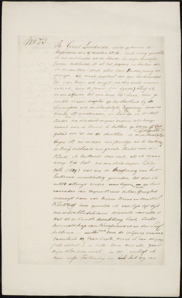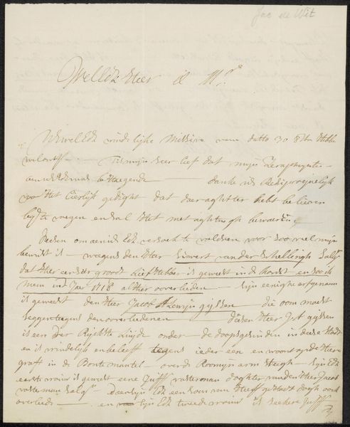 Curator: "Brief aan onbekend," or "Letter to an Unknown Recipient," potentially created between 1831 and 1838 by Pierre François De Noter, intrigues me. Its historical painting style and the media used - pen and ink - offer an interesting lens into the past, currently residing at the Rijksmuseum. What catches your attention initially? Editor: The density of the script. It feels like a glimpse into someone’s urgent thoughts, almost spilling out onto the page. How do you interpret this work, beyond it being a letter? Curator: Well, the script itself acts as a potent symbol. Think of calligraphy, often tied to status and education; the careful penmanship evokes not only communication but also a certain cultural weight, perhaps an air of officialdom or even an appeal for aid. What sort of emotional cues are you picking up from this letter's design? Editor: I guess, beyond the script itself, the sheer volume implies importance. Someone took a great deal of time to write this. But is there anything within the specific phrases themselves that carry weight? Curator: Precisely. Phrases like "...Belgique sous Guillaume 1 at sous la libertés..." reference a turbulent period in Belgian history. The iconography points to revolution, a fight for self-determination against the backdrop of societal upheaval. Consider what ‘liberty’ meant in that moment and how De Noter uses this document to represent that visually. Editor: So it's less about the individual words and more about the cultural context surrounding them? Curator: Indeed. This ‘letter’ becomes a visual record and, more broadly, a reminder of that struggle for identity through those specific figures, ideas, and values represented symbolically through language. By observing this text as an image, one begins to understand its historical and emotional gravity beyond just communication. What has caught your eye that is new? Editor: Seeing the letter now as an "image," rather than strictly writing, emphasizes the connection between historical moment, artistic choices, and this urge to solidify experiences with pen and paper.