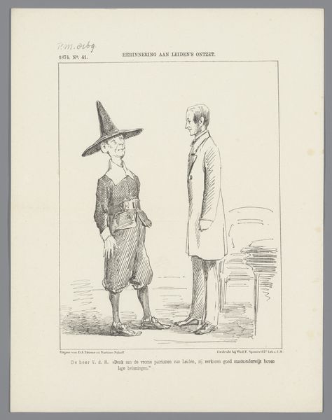 Curator: This is "Spotprent over twee kwakzalvers in de politiek, 1885," or "Cartoon about two quacks in politics, 1885," by Johan Michaël Schmidt Crans, a print executed in engraving. Editor: An immediate sense of mockery strikes me. The spindly figures, stark lighting, and caricature evoke sharp satire. It feels performative somehow. Curator: Performative in what way, precisely? Do you sense it from the contrasting shapes and their repetition? I note, for example, the severe, vertical hatching in the clothing that suggests a rigidity or a cloaked superficiality. Editor: The symbols here are just blatant: two figures styled as 'Apotheker Fleurant' and 'Dokter Purgon.' The clothing explicitly evokes the stage, the characters like theater masks hiding political actors underneath. The dialogue text reinforces that; look at the line referencing Moliere's "Malade Imaginaire". Curator: Yes, and beyond theatrical artifice, I see a structural critique in the arrangement of the characters within the frame. They're caught within these sharp right angles – architectural elements and even their very bodies–a confined space that could symbolize the constricting nature of political life. Editor: The towering hat on Apotheker Fleurant seems a blatant attempt at visual dominance; however, Doctor Purgon is slightly ahead and looks sly with a sort of condescension. It seems like they are both complicit in this "Malade Imaginaire," each benefitting from political theater. They are mirror images performing different acts in the same charade. Curator: Do you think Crans implicates the viewers as spectators in the deceit, too? The artist's hand, with all its lines, becomes a metaphor for the mechanisms behind political presentation. The rigid geometry of the scene is an almost prison-like display for the politicians on parade. Editor: The engraving feels more about the illusion of control than control itself; that's a fine observation! Thank you for helping illuminate that complexity today. Curator: Likewise; delving into the symbols has further deepened my analysis. Thank you.