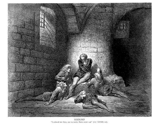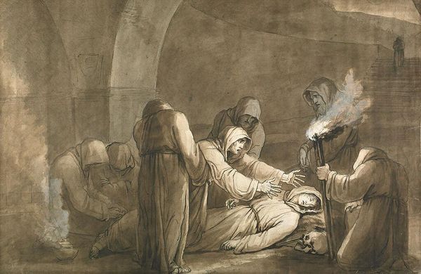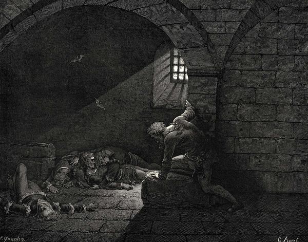 Curator: Today we’re examining Gustave Doré’s “The Inferno, Canto 33,” an engraving that plunges us into the depths of Dante’s hell. Editor: My immediate impression is one of profound darkness, both literally and figuratively. The stark contrast between light and shadow amplifies the suffering depicted. Curator: Indeed, Doré’s masterful use of chiaroscuro underscores the emotional weight of the scene. Observe how the linear quality of the engraving lends a certain rawness to the forms, enhancing the overall sense of despair. Editor: The cluster of figures becomes a potent symbol for utter destitution, and I feel it deeply. One figure seems to clutch at another with desperation, which speaks volumes about the reliance on kinship when life unravels completely. Do you agree? Curator: Certainly, the composition channels the intensity of that bond while simultaneously expressing alienation. The claustrophobic setting, with its rigid stone structure and minimal light source, serves to emphasize the characters' isolation. The sharp lines describing the stonework contrast with the softness given to the faces, highlighting their vulnerability within this prison. Editor: What grips me is the visual narrative embedded in this. Canto 33 tells the gruesome tale of Ugolino della Gherardesca and his sons, starved in a tower. Their expressions are silent screams of suffering and betrayal. Ugolino's eyes are fixated upwards as he mourns in agony. What is left except pain and the haunting memory of treachery? Curator: The visual elements—line, shadow, and composition—work together to create an overall effect of torment, highlighting the poem's underlying philosophical concerns. There is great interplay of these elements, working as structural components to convey suffering. Editor: Doré captures something timeless about human suffering, making "The Inferno, Canto 33" not merely an illustration but a harrowing exploration of existential anguish and humanity’s capacity for inhumanity. Its historical roots become something profoundly universal and applicable even now. Curator: It's true. He presents us with not just an image, but an experience, forcing us to confront these universal aspects. Doré’s brilliance is to manipulate the tools of his medium to evoke a visceral understanding of something beyond the visual.