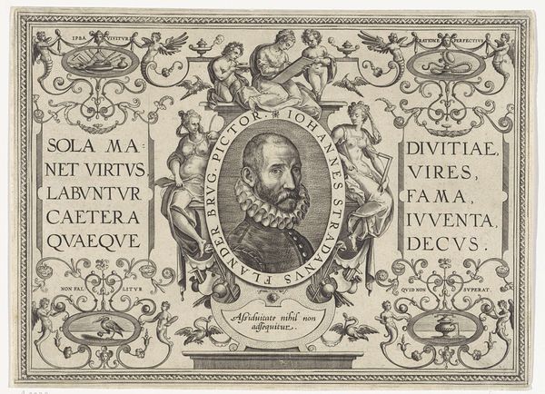 Editor: So, this is a portrait of Gerbrand Adriaensz. Bredero, created in 1622 by Hessel Gerritsz. It’s an engraving. I'm struck by the density of the text surrounding the image. How do you interpret this work within its historical context? Curator: The dense integration of text is significant. As an activist, I see this work speaking volumes about the intersection of art, literature, and societal values in the Dutch Golden Age. Bredero, a playwright and poet, is being memorialized, but more than that, his *voice* is being amplified. Consider how the text functions as both eulogy and cultural commentary, cementing his place in the Dutch literary landscape. Note the contrast between the controlled, almost rigid, lettering and the lively portrait of Bredero. What does that tension suggest? Editor: Maybe it shows a contrast between established societal norms and Bredero's more unconventional, creative spirit? Curator: Precisely. Think about how access to printed materials empowered marginalized voices and challenged existing power structures. This portrait isn't just a likeness; it's a declaration of Bredero's significance, a printed assertion of his lasting impact. Moreover, the laurel wreath, a classical symbol, hints at the ambition to equate him with past cultural heroes. What’s striking to me is that the printing press allowed these sentiments, traditionally reserved for elites, to be disseminated more widely. Does that change your perspective on the portrait? Editor: Definitely. I initially saw it as a simple portrait, but now I understand it as a potent statement about Bredero's cultural importance. Curator: Exactly. By intertwining art, literature, and accessibility, this engraving celebrates not only an individual, but also the burgeoning power of cultural production. Editor: That makes me consider how even portraits can participate in broader conversations about cultural identity and value.