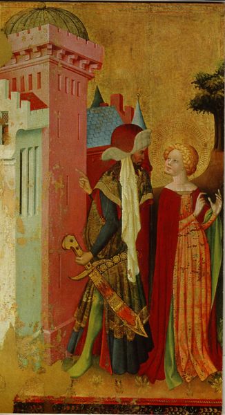 Lippo di Andrea created this tempera on panel artwork, St. Benedict - The Annunciation - A Kneeling Nun. Notice the composition, which is divided into four distinct sections, each framed by subtle architectural motifs that suggest depth and separation. The colour palette, dominated by soft blues, reds, and muted earthy tones, creates a serene yet somewhat melancholic atmosphere. Andrea uses line and form to guide the viewer's eye, from the figure of St. Benedict on the left, to the central scene of the Annunciation, and finally, to the kneeling nun on the right. The linear perspective within the Annunciation scene, although not perfectly executed, attempts to create a sense of space and depth. This construction invites a reading of the work through the lens of semiotics. The careful placement of each figure—St. Benedict, the angel, the Virgin Mary, and the kneeling nun—may represent a symbolic order, where the act of annunciation serves as a pivotal moment connecting divine intervention with human piety and contemplation. The structure, therefore, serves not merely as an aesthetic choice, but as a profound statement on faith and devotion.
