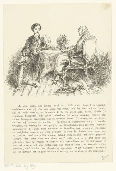 This print, "Jongeman leest brief" or "Young man reading letter," was created by Paul Gavarni. It's a lithograph, a printmaking process that relies on the chemical repulsion between oil and water. The image is drawn on a stone or metal plate with a greasy substance, then inked. The ink adheres only to the drawn areas, and the print is made. Look closely, and you’ll notice the tremendous detail Gavarni achieved with this technique, from the textures of the men's clothing to the ornate details of the sofa. Lithography was a relatively new medium in the 19th century, enabling artists like Gavarni to produce images quickly and in large quantities. This reflects the rise of consumer culture and mass media, where images could be widely distributed and consumed. Consider also how this print relates to the world of labor. It highlights not only the labor of the artist, but also, perhaps, the lives of leisure enjoyed by the well-to-do. It invites us to consider the social dynamics of the time.