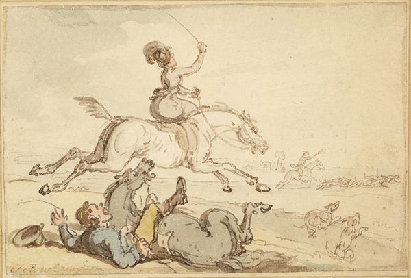 Henry William Bunbury animated this sheet with pen and watercolor around the late 18th century. A central motif here is the skeleton hanging from a gibbet, a stark symbol of death, traditionally intended to deter criminals. Yet, observe its eerie presence here, juxtaposed with the chaotic scene of a rider falling into water. The skeleton, often a memento mori, has roots stretching back to ancient Egypt, where they were used in banquets to remind guests of their mortality. Here, however, it seems to mock the folly of the hunt, perhaps a comment on the transience and absurdity of human endeavors. The image as a whole hints at the ever-repeating cycle of life and death, and the precariousness of existence. The skeleton is a stark reminder of our ultimate fate, while the chaotic tumble speaks to the unpredictable nature of life. These images echo through time, reminding us of our shared human condition.