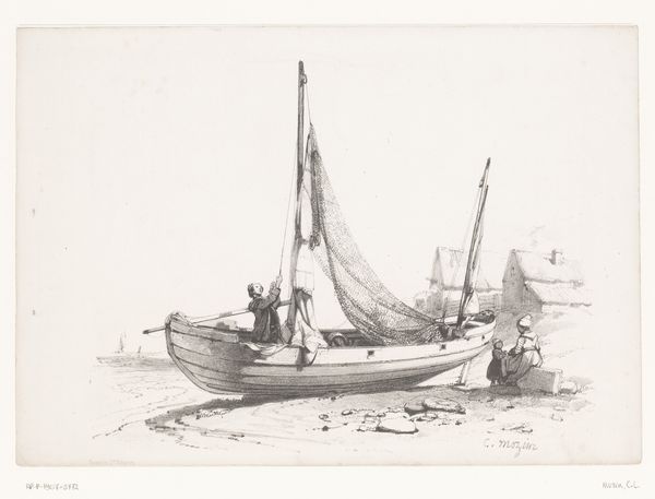 Editor: So, this is "Twee boten op het water," or "Two Boats on the Water," an etching by Henri Rul, made sometime between 1872 and 1913. The scene feels really quiet, almost desolate. What stands out to you about it? Curator: It's interesting how Rul captures this sense of stillness. For me, this image speaks to the socioeconomic realities of the fishing communities of that era. The boats, rendered with such delicate lines, weren’t just objects; they were tools of labor, and those laborers are noticeably absent. What narratives are suggested by the emptiness of the boats? Editor: That's a perspective I hadn't considered. I was just focusing on the aesthetic qualities, the muted tones, and the reflections on the water. So, you see this more as a social commentary rather than simply a landscape? Curator: Absolutely. The landscape itself is not neutral; it is a space of labor, struggle, and survival. We have to ask ourselves who is allowed to depict these realities and for what audience. What stories do these visual choices tell? Editor: I see your point. By focusing on the tools, the boats, instead of the people, it indirectly highlights their absence, their potential hardship. The boats aren’t romanticized; they're just…there. Curator: Precisely. And the print medium itself allows for a wider distribution of this perspective, engaging a broader audience in considering these issues. How does knowing that it's a print impact your interpretation? Editor: Well, that does change things. Prints make art more accessible and make statements to broader communities. It makes the artist seem even more intentioned about the artwork having a message. Curator: Exactly. Considering the piece through the lens of social activism truly enriches our understanding. Editor: This has been such an enlightening discussion; I never thought of looking at it that way. Curator: And that's the power of art: It invites constant reevaluation.