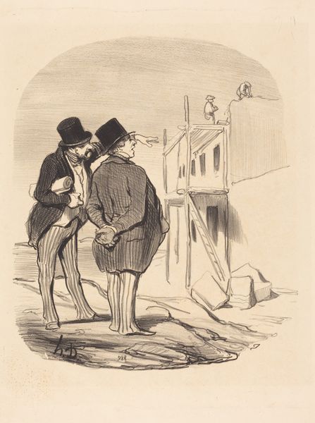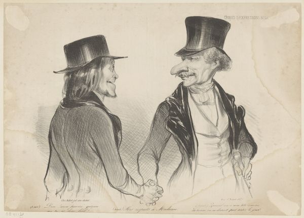 Curator: "Faut de la prudence père Balivot, vot petite a seize ans..." – a lithograph created in 1842 by Honoré Daumier. Editor: Oh, immediately a scene of whispered secrets and perhaps a touch of danger. Look at their postures, slumped over a table. What are they plotting, do you think? The air feels thick with unspoken words and cheap wine. Curator: It's Daumier, so social commentary is likely at play here. He was a master of capturing the nuances of Parisian life and often with a satirical bite. The title roughly translates to "Lack of caution, Father Balivot, your little one is sixteen..." – suggesting perhaps a less than reputable negotiation. Editor: Yes! Sixteen, a loaded age for vulnerability in a patriarchal society, so the composition— the slumped postures, the averted gazes – reinforces this sense of exploitation and a power imbalance. Curator: Absolutely, the dark lines and stark contrasts within the lithograph, emphasize the figures' less flattering features. It’s grotesque and honest; Daumier really had an eye for exposing the flaws of the Bourgeoisie. Even the bottle centered between them could serve as a visual metaphor, right? Intoxicating ideas being traded at that table. Editor: Right! The bottle as this ambiguous emblem, dividing and uniting them in something shady! What interests me, as well, is the framing itself. It's boxed, quite literally drawing these figures in and implying a greater conspiracy and even confinement. Curator: Very true. The artist utilizes Romanticism. See how these small details like exaggerated faces make them identifiable. They have names and they could live anywhere. Editor: So much in just a few lines etched into stone. Each viewing offers new layers to peel back, meanings within meanings – a microcosm of society tucked inside a pub. Curator: Agreed. Daumier really asks us to not just witness this scene but to really consider the ethical quandaries he sets before us. Editor: A quiet scandal reverberating through time. Even now, it resonates uncomfortably well.