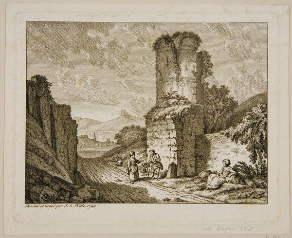 Editor: Here we have Johann Adolph Darnstedt's "Ruins of Kifthaüser and View of the Golden Pasture." It evokes such a feeling of melancholy, doesn't it? What significance might these ruins have held for viewers of the time? Curator: Ruins are heavy with symbolism. They represent the passage of time, the fall of empires, and perhaps even a longing for a lost, idealized past. Notice the figures at the base of the rocks. What feelings do they evoke? Editor: They seem to be resting, maybe contemplating the landscape. Perhaps they are reflecting on history? Curator: Precisely! The ruins act as a tangible link to that history, prompting reflection on mortality and the cyclical nature of civilization. The "Golden Pasture" hints at an Edenic state, now lost. Editor: I see. The contrast between the ruins and the golden pasture creates this tension. Curator: Exactly. The artist uses these symbols to speak to enduring human concerns about loss and the search for meaning within time's relentless flow. Editor: That adds so many layers to what initially seemed like just a landscape. Thanks! Curator: Indeed! It highlights how symbols enrich our understanding of art and history.