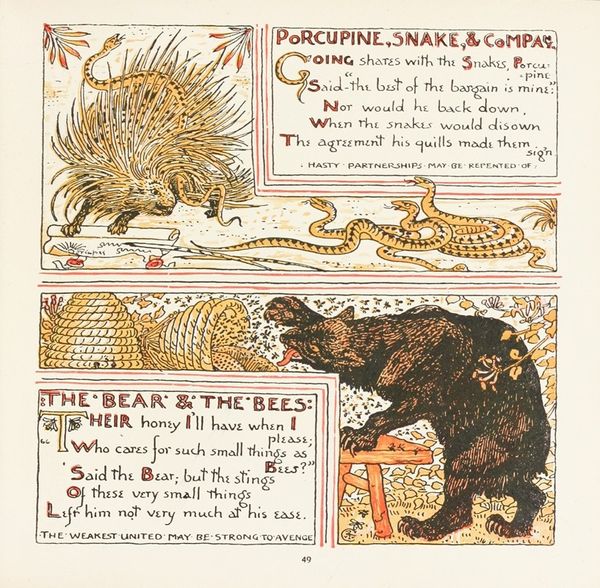 Walter Crane created this image, "The Mouse and the Lion, The Married Mouse", with what looks like pen and ink, probably around the turn of the century. It's clearly illustrative, but the process of making these illustrations is a world away from today's digital art. Crane's drawing here is so controlled, so meticulous. He creates this incredibly detailed scene, but it's the mark-making that really draws me in. The way he uses line to create texture, like in the lion’s mane or the netting, it’s all so deliberate. The linework isn’t trying to trick you into thinking it’s anything other than ink on paper. The palette is so restrained, almost monochrome with that touch of pale yellow adding just enough depth. Look closely at the contrast between the delicate linework of the mouse and the weightiness of the lion. It’s like Crane is emphasizing the power dynamic, but also the potential for the small to overcome the large. His process, so visible in the final image, is what makes it so compelling. It reminds me of the work of Aubrey Beardsley, another master of line. Crane's work invites us to appreciate the beauty of imperfection and the openness of interpretation.