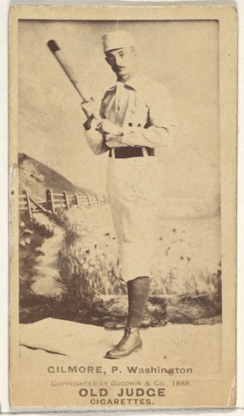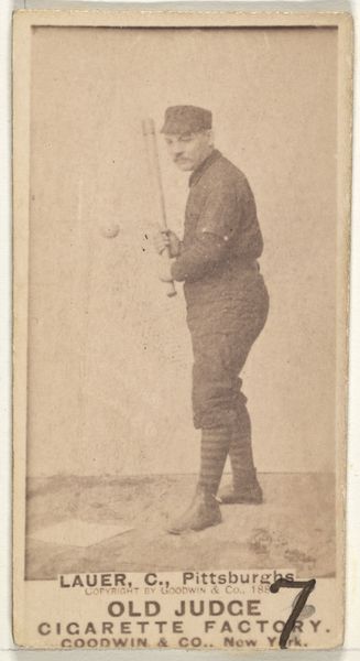 This is a baseball card of Thomas H. "Toad" Ramsey, a pitcher for the Louisville Colonels, created by Goodwin & Company as part of the Old Judge Cigarettes series. The card presents a sepia-toned image with a rectangular format, emphasizing Ramsey's figure against a blurred background. The composition is structured around the diagonal line created by the baseball bat, which crosses Ramsey's body. This line divides the frame and introduces a sense of dynamic tension. The image plays with semiotic codes of athleticism, using the uniform and bat as signs of his profession. Ramsey’s gaze adds another layer, challenging viewers to meet his eye. Consider that this card was made to promote cigarettes. What we see here is not just a baseball player, but a cultural artifact embedded in a complex network of commerce, representation, and early sports culture. It invites us to reflect on how images are constructed to convey meaning and value.