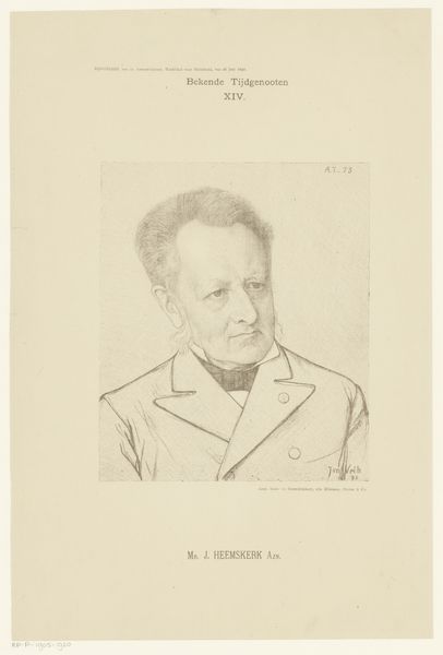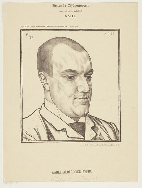 Curator: Here we have Jan Veth's "Portrait of Charles Boissevain" from 1893, residing here at the Rijksmuseum. A masterful drawing rendered through etching, graphite, and printmaking. Editor: There's something strikingly stark about the line work. It creates an almost uncomfortable intensity in the sitter's gaze, wouldn't you say? It feels more than just representational. Curator: Indeed. Veth’s understanding of form through line is exceptionally rigorous here. The precision allows a very keen exploration of physiognomy, the structural planes of the face defined by meticulous hatching and cross-hatching. Look how the lines become darker and denser in areas that need greater shadowing or definition. Editor: That meticulous layering suggests a deep investment in the labour of representation itself. We often forget the repetitive physical action involved in creating etched lines; it isn't merely about facile expression, but time, labor, and considered pressure brought to bear upon the plate, and, ultimately, on Boissevain's social standing. Curator: Exactly. The composition too—the tight framing and profile view—direct the gaze straight toward the details of his character, so clearly defined. His intellect appears quite pronounced. Editor: Although the square frame itself and Veth’s signature introduce an interesting, conflicting structure to the piece that wasn't traditionally honored or celebrated. Was he intentionally attempting to democratize portraiture by allowing the subject to dictate material process and structure, which were traditionally for high class citizens and religious idols? Curator: An astute observation. Perhaps that boundary erosion between subject, material, and status is deliberate. It would certainly fit with some of the sociopolitical undercurrents that circulated in intellectual Dutch circles at the time. The etching is realism personified. Editor: It really does give a potent impression of the moment. Considering how art history canonized painting and sculpture at the time, it gives you insight into Veth's decision to focus on working and elevating the crafts of drawing, graphite and printmaking. It opens our view to all types of materials and what "artwork" represents. Curator: Agreed. "Portret van Charles Boissevain" really showcases how method can reinforce concept, even to the modern eye. Editor: It’s amazing to observe how much meaning material application can hold and provide in the study of this particular subject and era of production.