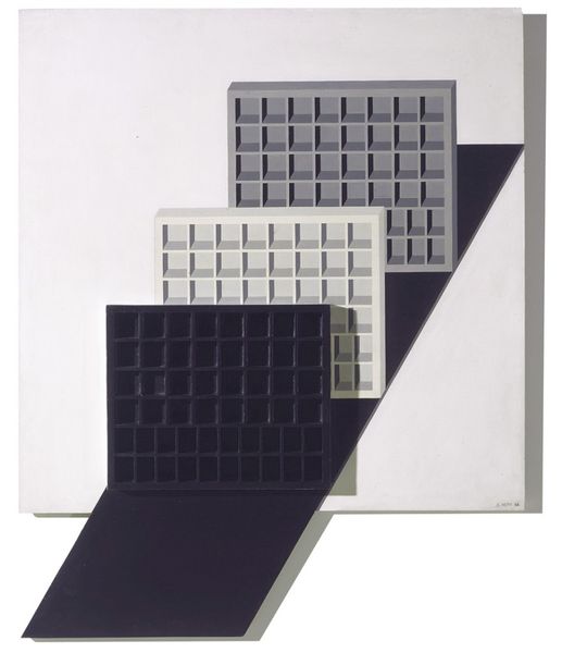 Curator: Eduardo Nery's "Oscilações do Claro Escuro I," created in 1967, offers a fascinating interplay of minimalist forms using mixed media. It's a relief, incorporating acrylic paint to build this pattern of shadow and light. What catches your eye first? Editor: It's so stark, almost architectural. The cubes, so perfectly white against the strong black shadows, it feels like a city viewed from above, doesn’t it? There's a powerful geometry, but it also feels unsettling, almost…clinical. Curator: I see what you mean. There’s a rigorous quality, but for me, the "Oscilações" – the oscillations – really come through. My eyes keep dancing, trying to decide if the blocks are floating or sinking, if the shadows are real or painted on. It's like a game of perception. Editor: And isn't that reflective of the anxieties of the era? Post-war, the cold war brewing – this stark, geometric art often acted as a refuge from chaos but also mirrored a sense of unease and the potential for societal fracture. It strips away anything organic, anything traditionally beautiful. Curator: Absolutely, and you're touching on a deeper point. The high contrast emphasizes that the world isn’t always as clear cut as we would like it to be. And with the slightly rough texture of the white cubes, it gives it this kind of raw, immediate presence. Editor: Right. There's this inherent critique of idealized forms; it refuses easy aesthetic satisfaction. These shadows, while defined, don’t give you much information—are they about industrial progress or an oblique commentary on social inequities hidden in plain sight? This era in art wrestled with portraying how power can cast long shadows, literally and metaphorically. Curator: Yes. But it’s also playing with positive and negative space, a kind of dance on the surface. And while there is certainly underlying anxiety in all of this art, I appreciate that Nery embraced, even highlighted it! I guess, at the end of the day, you simply cannot help but appreciate it. Editor: In the end, these carefully calibrated ambiguities give rise to thought-provoking commentary. That dialogue between precision and uncertainty makes for a compelling exploration of its time.