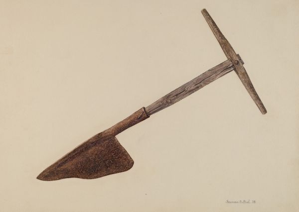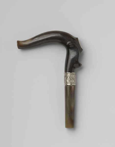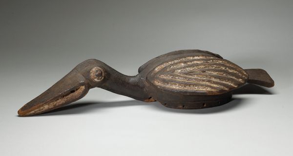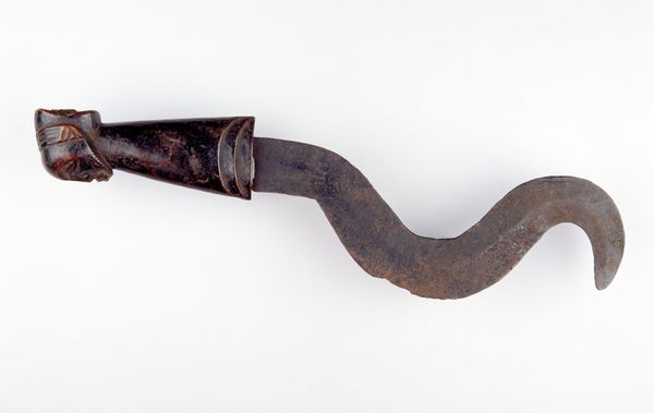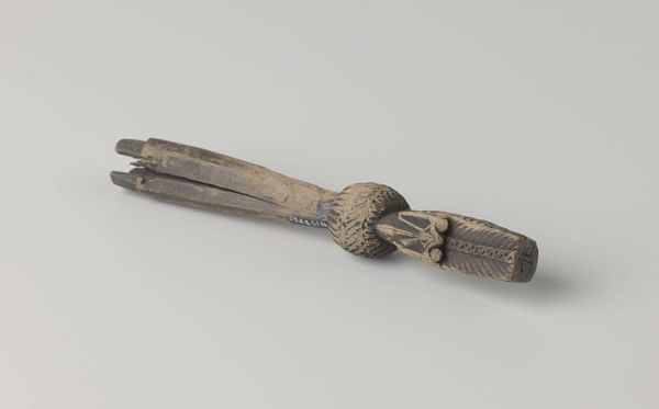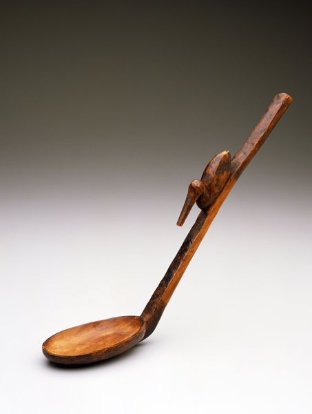 Editor: So, this is the Baule Divination Hammer, probably from the 20th century. It’s a wooden assemblage. I find the combination of the dark wood and lighter element on the bottom so striking; there is almost an inherent tension between the two... What strikes you about it? Curator: The stark contrast isn't merely visual, but deeply rooted in the socio-political structures of the Baule people. The Divination Hammer wasn’t simply a tool but an instrument wielded within a system that reinforced hierarchical power. The “hammer” embodies authority, and its use in divination rituals likely dictated social behaviors. Who held the power, who was silenced, whose futures were controlled? What questions do you think need to be asked to understand its history? Editor: It does seem very deliberate… like every piece, every curve, served a specific purpose. What about the material? Does the type of wood impact its meaning? Curator: Absolutely. Material selection would have been very intentional. Is it a locally sourced material? How does its selection reinforce connection to place and cultural knowledge? Consider how access to certain materials could have been restricted, reflecting or reinforcing existing power dynamics. Editor: So, reading the sculpture then requires unpacking these historical and social layers. It isn't just about aesthetics, but power? Curator: Precisely. This object prompts us to interrogate how cultural objects can both reflect and perpetuate social structures, impacting identities and power dynamics within the community and beyond. The snake spiraling the handle, for instance…is that symbolic of transformational wisdom, or potential menace and threat? The object seems meant to wield not just influence but active change through this interpretation. Editor: That gives me a completely new perspective. I was initially drawn to the form, but now I see how vital the socio-political context is to its reading. Thanks for that! Curator: And thanks for getting me thinking of how these types of cultural objects maintain power.