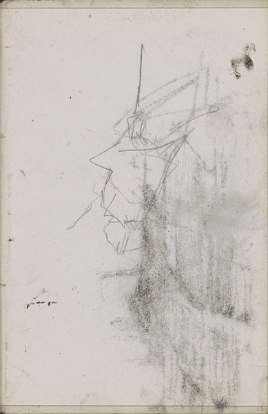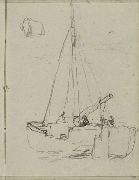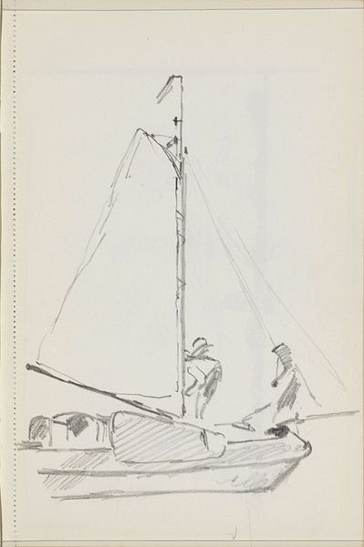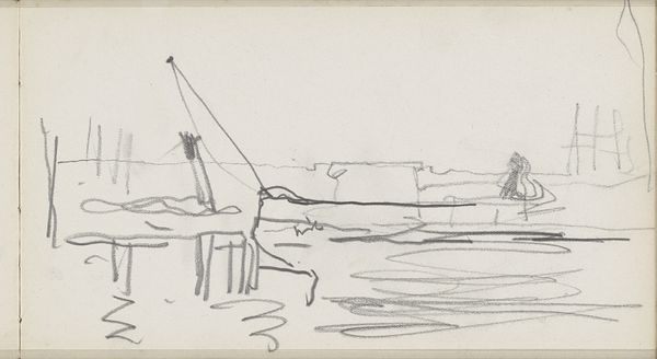 Editor: This is "Zeilschip op het strand," or "Sailing Ship on the Beach," a pencil drawing by George Hendrik Breitner, made between 1880 and 1882. It's currently at the Rijksmuseum. I find it very loose and ephemeral; you can almost feel the wind and the impermanence of the scene. What do you see in this piece from a formalist perspective? Curator: Initially, observe the deliberate emphasis on line. The drawing eschews chiaroscuro in favour of delineating forms with remarkable economy. Breitner, ostensibly interested in representation, reveals his primary focus through the autonomy of the line itself. How would you describe the composition's spatial relationships? Editor: It seems like he's flattened the perspective. There's not much depth; the ship seems almost pressed against the background, with a very shallow foreground. The texture, given the quick strokes, isn't really smoothed out. It's raw. Curator: Precisely. This ‘raw’ quality isn't merely descriptive but constitutive. Consider the role of negative space, especially around the masts and sails. Does this space merely define form or actively engage in a dialogue with the drawn elements? Further, note the marks near the base which disrupt pure representation, reminding us of the artifice inherent in drawing itself. Editor: So, you're saying the negative space isn't just emptiness; it's part of the structure and tension? And those scribbles pull us back to the fact that it's just lines on paper? I hadn't considered it that way. It definitely gives a deeper layer to appreciate within the piece. Curator: Exactly. Breitner makes us consider not just what is depicted, but the act of depiction itself through line, composition and texture. I trust you will appreciate this work even further through similar approaches to your encounters with art.