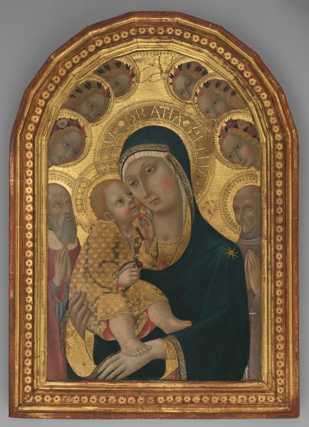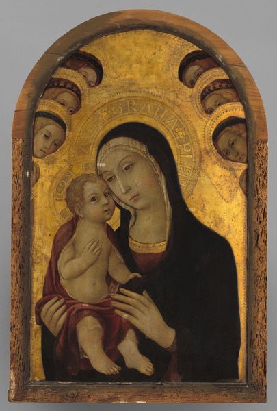 Editor: Here we have Sano di Pietro's "Madonna and Child," likely painted between 1445 and 1463. It’s an oil painting and you can find it in the Metropolitan Museum of Art. It strikes me as a particularly intimate depiction. The close proximity and the Madonna’s tender gaze really emphasize the relationship between mother and child. How do you interpret this work? Curator: Let's analyze its formal qualities. Note the artist’s sophisticated use of line to create definition and form; how it contributes to the creation of this sense of intimacy. Also, observe the halos. What does the size and rendering suggest to you about importance and meaning? Editor: The halos are hard to ignore, so gilded and stylized, creating this... heavenly feel. Curator: Indeed, they’re almost geometric in their perfection, contrasted against the softness of the faces. Consider too the colour palette – the juxtaposition of the Virgin's dark robes against the gold background and the Christ Child's bright skin, and how that might signify their respective roles within the divine narrative. Editor: It is definitely a balanced composition that draws your eye in to the subjects. The symmetry is grounding. Curator: Exactly! The visual structure here directly contributes to the overall reading of the piece. Each element of its composition reinforces our understanding. What is your sense of what Pietro tries to communicate? Editor: That’s given me a lot to think about, considering those relationships, and how it all functions formally rather than just emotionally. Thank you! Curator: It highlights how the visual language used strengthens the artist's intentions in conveying their meaning.