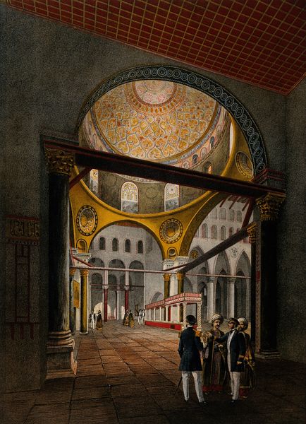 Editor: Here we have Jean-Léon Gérôme's "Interior of a Mosque," painted in 1870. It's an oil painting, and I'm immediately struck by the almost voyeuristic feeling, like we're peeking in on a private moment. What stands out to you when you look at this piece? Curator: It’s true; Gérôme captures a private, religious experience and presents it for Western consumption, which situates it within a complicated colonial gaze. We must remember that this work is part of the Orientalist movement. It begs the question: whose perspective are we seeing? What is Gérôme trying to say about the East to his Western audience? Editor: So, you're saying it's not just a depiction, but also a commentary from a particular point of view? How does the visual composition reinforce that idea? Curator: Precisely. The light and shadow play a key role, almost theatrical, highlighting certain figures while obscuring others. This selective visibility mimics a power dynamic. Notice how the architectural details, while beautifully rendered, create a sense of enclosure. Does it feel reverent, or restrictive? Is he celebrating or appropriating Islamic culture? These are crucial questions to ask. Editor: I see what you mean. The arches almost become like frames, further distancing us as viewers. Curator: Exactly. And it's important to acknowledge that Gérôme’s work, while celebrated for its realism, is also a construct, shaped by the politics of his time. Thinking about its historical context reveals deeper issues around cultural representation. How do you feel knowing that the ‘truth’ in the artwork is but a prejudiced snapshot of reality? Editor: I'm going to have to rethink my initial reaction. I hadn’t considered how the social context changes the work's significance and how problematic that point of view is. It seems there's so much more to art than just the surface image. Curator: Indeed. By exploring these layers, we confront not only the art but also our own assumptions and biases. It is important to learn about different communities, but to see with an intercultural vision not one driven by our prejudiced assumptions.
