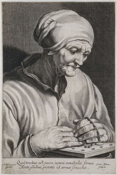 This is Nicolaes van Haeften's etching from 1694, depicting an old woman with a glass and a jug. The image invites us to consider the social position of older women in Dutch society at the end of the 17th century. How was old age treated, and what was expected of women at this stage of life? Such questions take us beyond the simple description of an image and into the realm of cultural history. Here, the woman’s somewhat caricatured features and simple attire suggest a figure from the margins of society. The detailed etching style, common in Dutch Golden Age art, paradoxically adds to the blunt realism of the portrayal. Was this made for a middle-class audience who consumed images that confirmed their social status? To understand this work more fully, we might look into archives and period literature. By examining historical records, we can begin to uncover the complex social dynamics of the time and interpret art not just as aesthetic objects but as cultural documents.