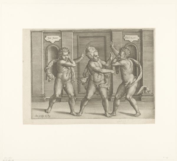 Editor: This engraving, "Brighella en Trivelino," is from somewhere between 1603 and 1657, and it’s interesting. I’m struck by the detail in the figures' costumes – it’s really impressive, especially considering the medium. What stands out to you? Curator: What I find compelling here is the labor inherent in producing such an intricate engraving. Consider the craftsman’s skill and time dedicated to creating these fine lines, each precisely placed to construct these Commedia dell'Arte figures. It asks us to question the social function of printmaking, its role in disseminating images and stories. Think about who had access to this image, and the kind of artisanal work it represents. Editor: That’s interesting! I was mostly looking at the artistry, but I see your point about the labor and accessibility. Does the choice of engraving as a medium speak to the subject matter in any way? Curator: Absolutely. Engraving, as a reproducible medium, aligns with the performative nature of Commedia dell’Arte. Both rely on repetition and adaptation, taking traditional characters and situations, and reinterpreting them for different audiences. Furthermore, look at the stark black and white, what limitations of production and access might those necessitate, and what kind of circulation of wealth do those considerations entail? Editor: So it’s not just about the finished image, but about the whole system of production and consumption surrounding it? Curator: Precisely. It’s about acknowledging the social relations embedded in the very materiality of the artwork. It's not just about high art, but also about the artisan's place in society, and who ultimately benefits from their skilled work. Editor: That really changes how I see it. I'll definitely be thinking about the materials and labor involved more often now. Thanks! Curator: My pleasure. Seeing art through a material lens reveals a deeper understanding of its purpose and the society that shaped it.