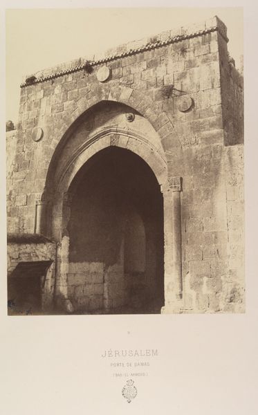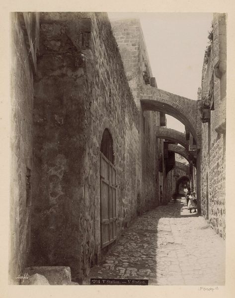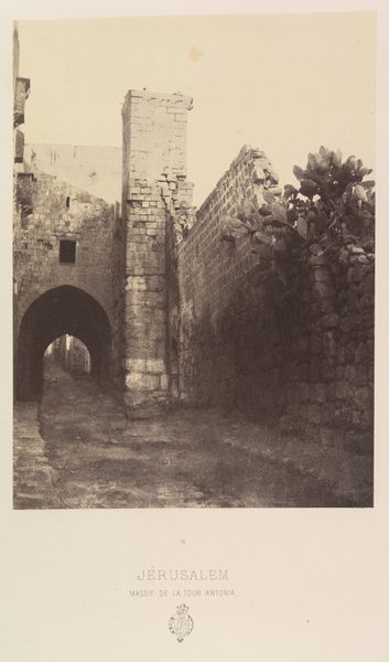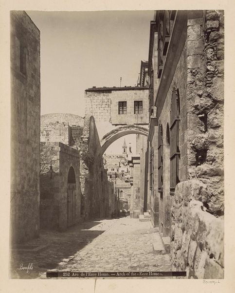 Curator: Here we have Félix Bonfils' photograph, "Street with Arches in Jerusalem," taken sometime between 1867 and 1877. Editor: It feels weighty, solid. The arches tunneling into shadow create this very grounded sense of history and permanence. Curator: Indeed. Bonfils was part of a wave of 19th-century photographers documenting the Middle East, capturing scenes that spoke to European audiences' fascination with the Holy Land. This particular image presents Jerusalem as an ancient, almost timeless city. Considering its historic role and ongoing conflicts, how might the image's seeming peace complicate matters? Editor: The very act of photographing itself transforms labor and perception. The labour of quarrying these massive stones, the hands that laid them, the street sweeper... where are they in the colonial gaze? What are the mechanics behind producing images like this in the 19th century? The specific processes used - the wet collodion, the albumen prints - these techniques influenced how the scene was rendered and understood. How the labor of maintaining that ancient structure goes unseen now, but can be seen with a modern photograph. Curator: Absolutely. There is a power dynamic at play, with Bonfils, a European photographer, framing this view of Jerusalem for Western consumption. It reduces complex social structures and ancient cultural identities into digestible visual shorthand. You point out that there is the act of taking the photo and the selection and distribution behind such a product in 19th century Ottoman Palestine. Editor: The arrangement of those arches and careful composition speaks volumes about aesthetics. We see something grand created from simple material: the stone of which Jerusalem is built. What implications has that in the relationship between man and construction. Curator: For me, this photograph serves as a reminder of how deeply intertwined image-making is with cultural narratives, often reflecting and perpetuating specific viewpoints of that particular place in history, erasing the marks of labor. Editor: Yes, this reminds us to delve into the layers of production that form the image we see and not fall into romantic notions of what is presented at face value.